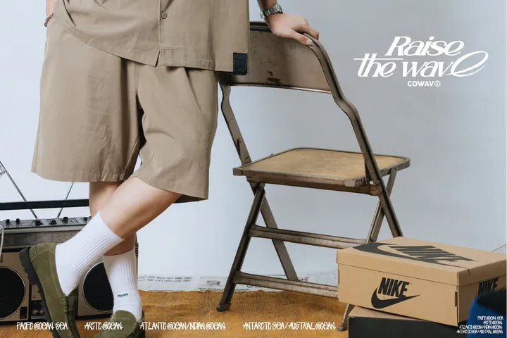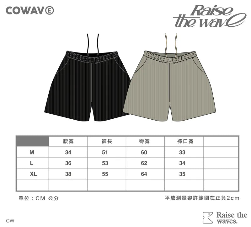 版型採用百搭的沙灘褲版型,寬鬆的輪廓無論是搭配T-shirt 或是襯衫都合適。細節部分於褲口加入COWAVE黑色織標,增加品牌辨識度外也讓單品細節更具完整。