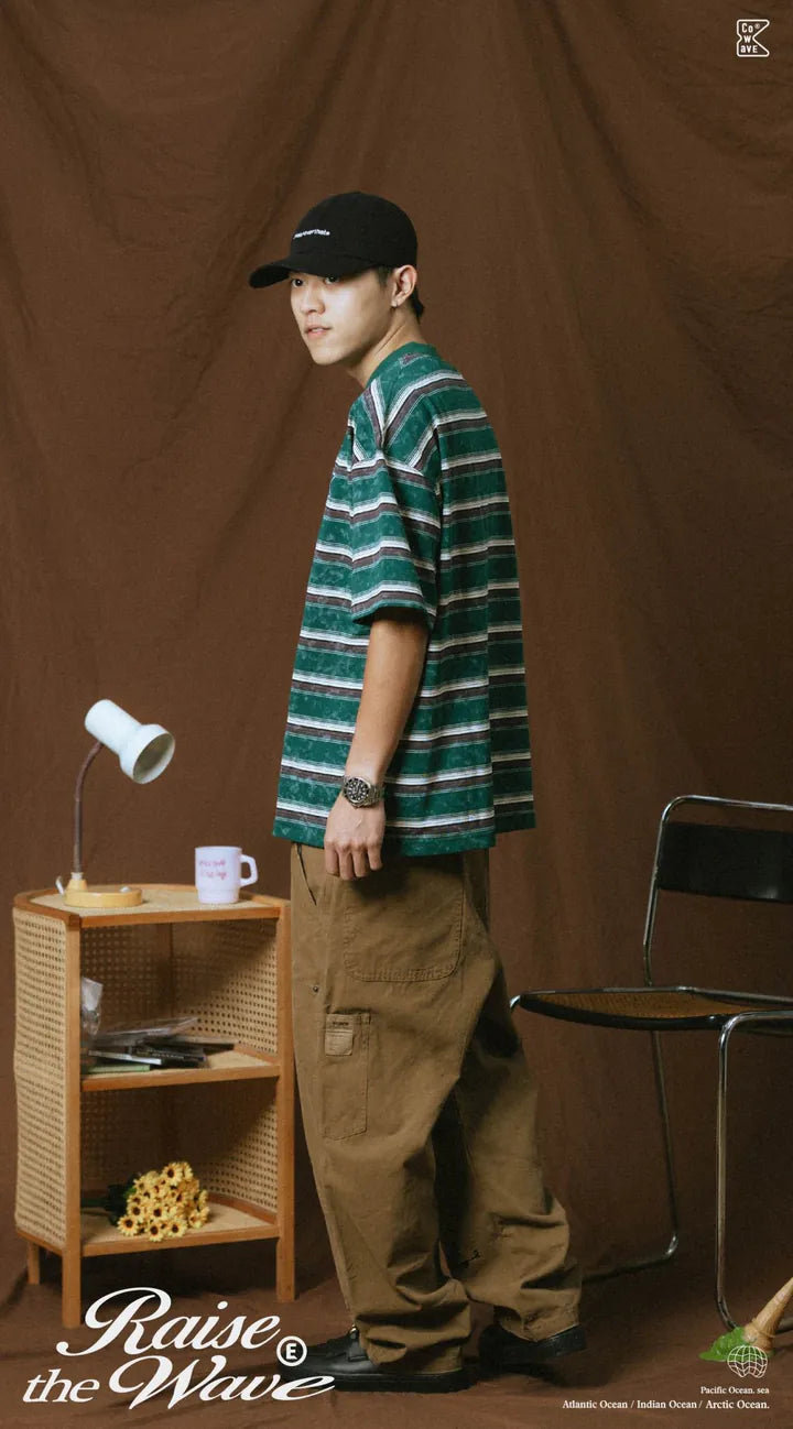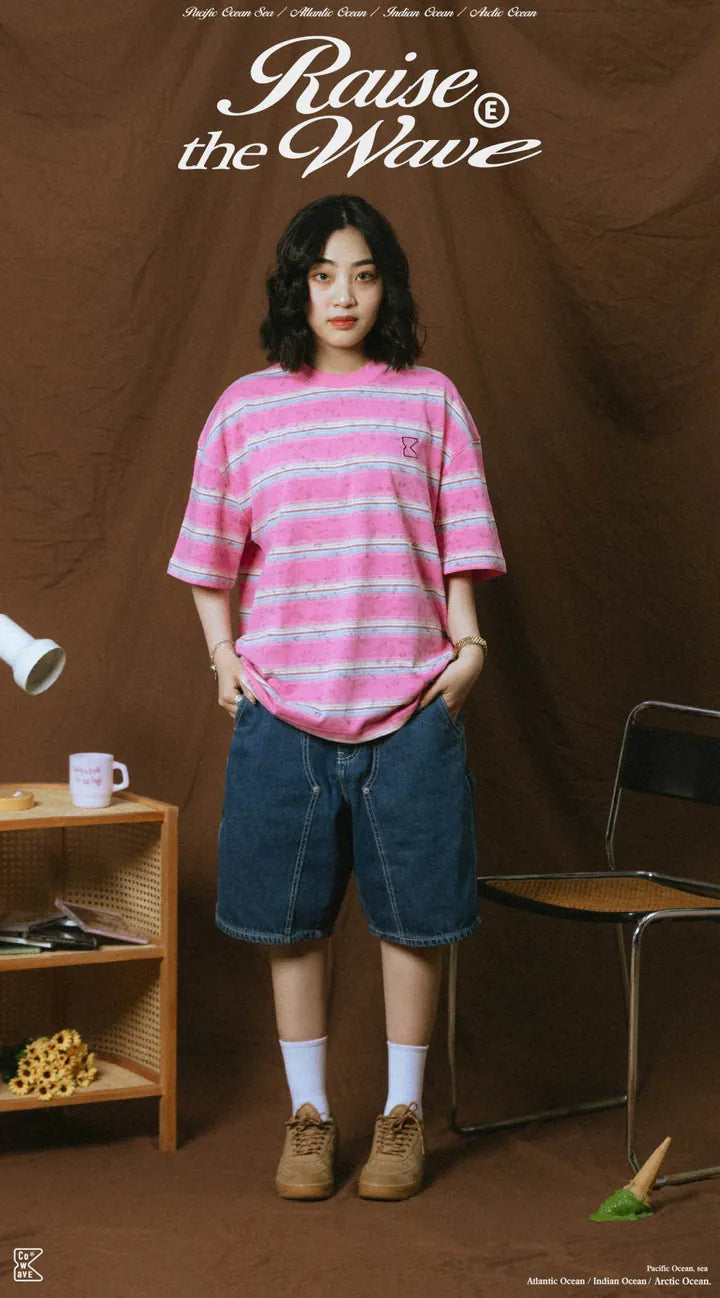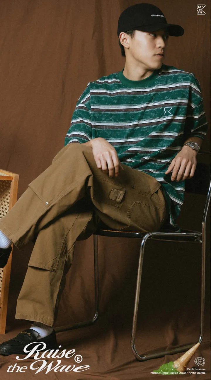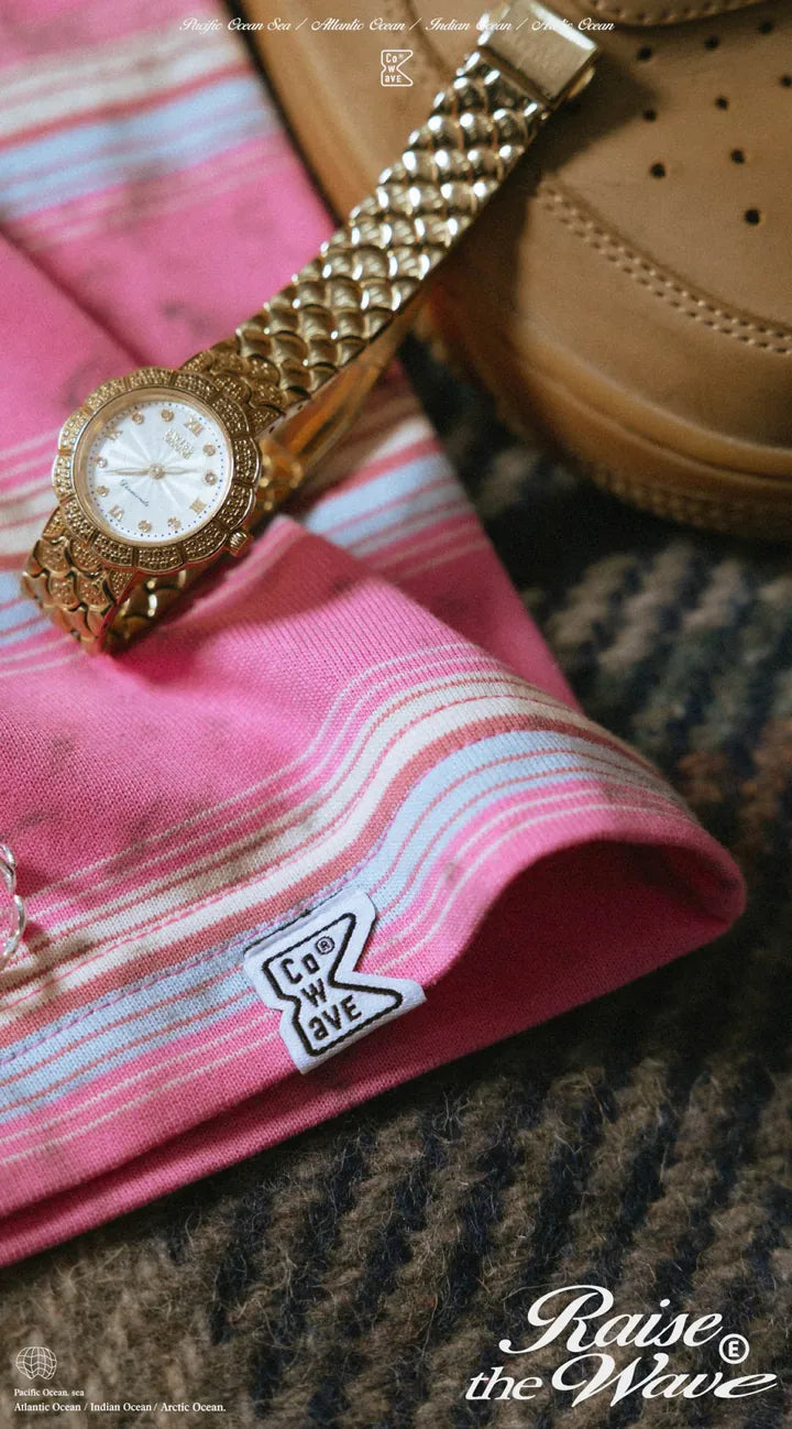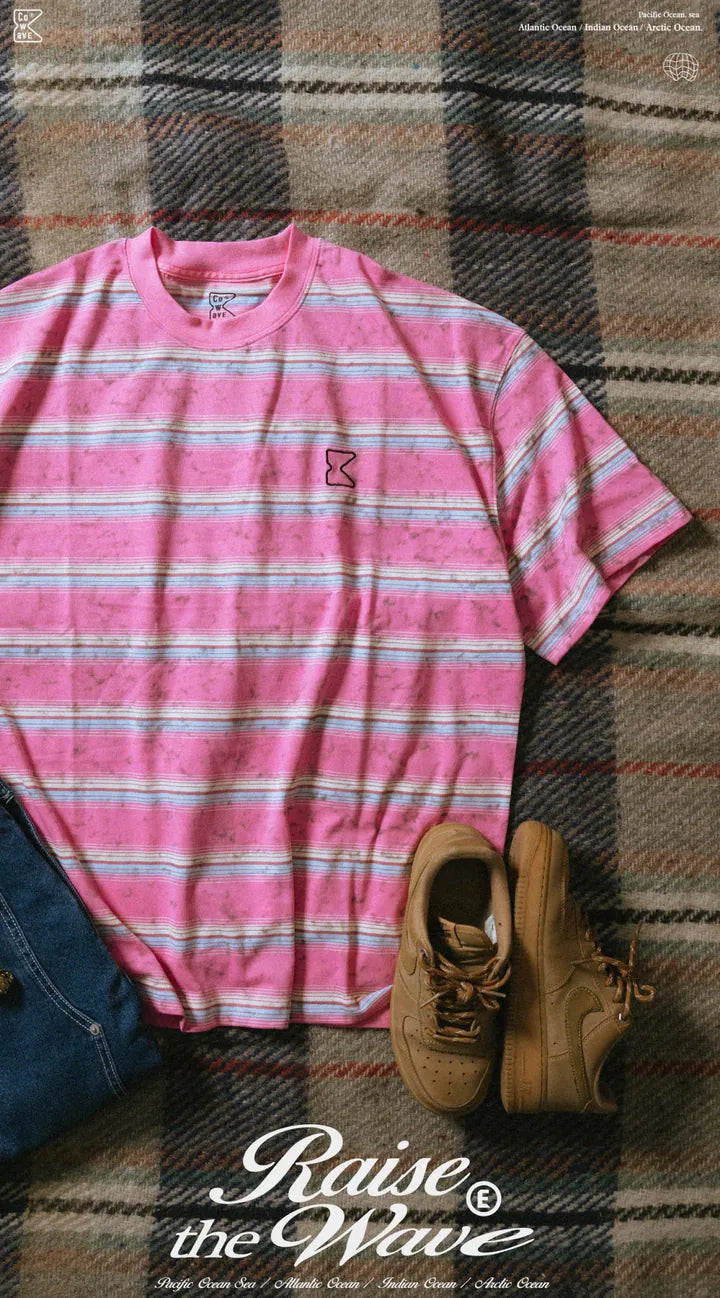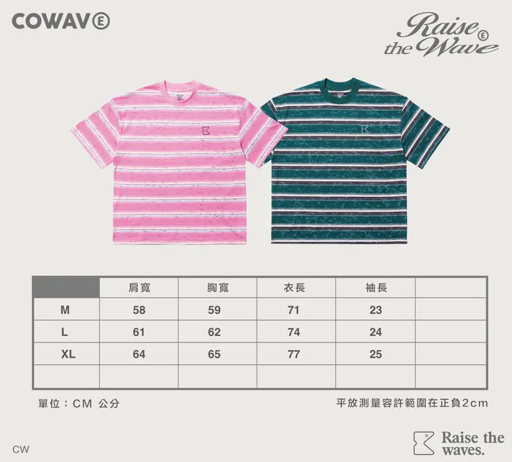 此款條紋tee採用寬版落肩版型,適合任何身型,無論是單穿或內搭都輕鬆駕馭。配色上選用低飽和的粉色與墨綠作為主調,跳脫制式條紋設計,並融入『浪花痕跡』概念,以「洗舊炒雪花」工藝重新詮釋條紋美學,打造出如浪花拍岸般的自然肌理。結合復古條紋元素,於懷舊與現代之間取得巧妙平衡,呈現輕鬆卻不失個性的夏日氛圍。細節部分,左胸口加入極簡波浪形圖騰,象徵品牌理念「Cowave = Coast + Wave」,簡潔卻充滿識別度。