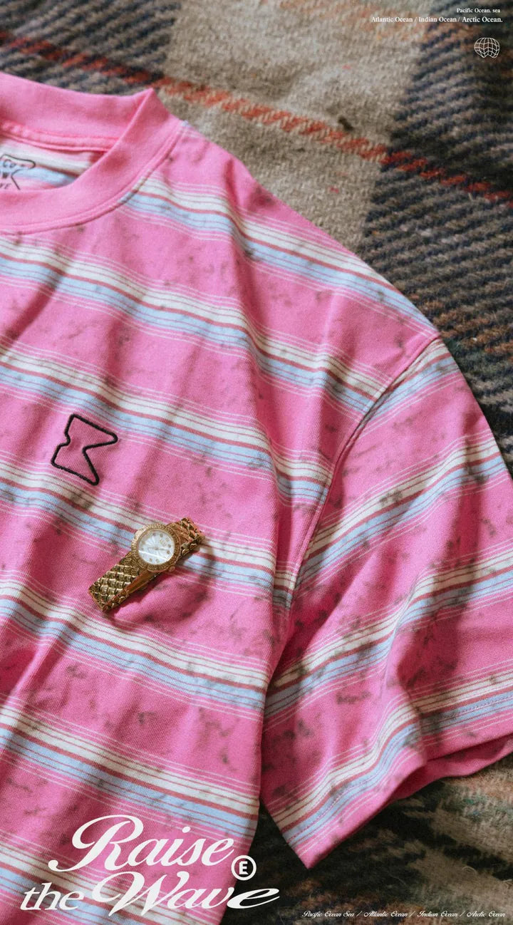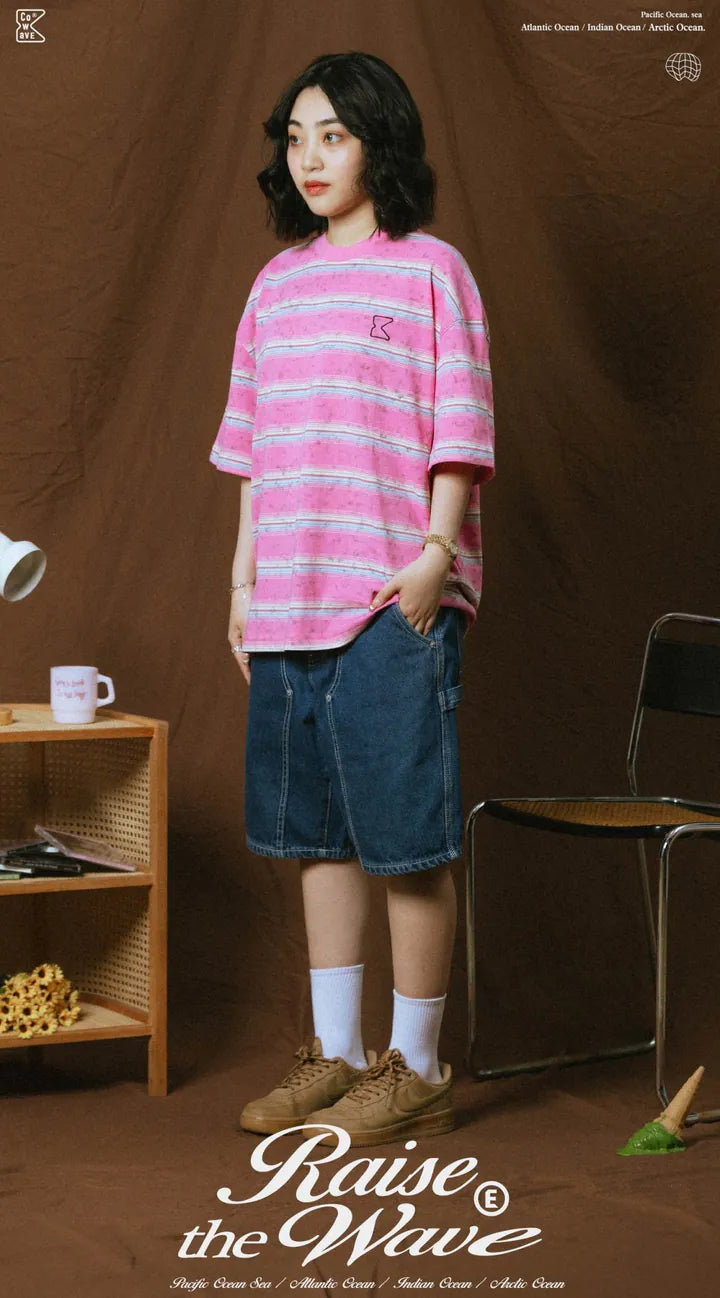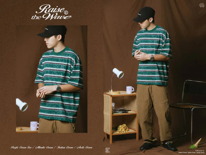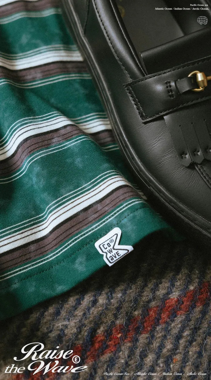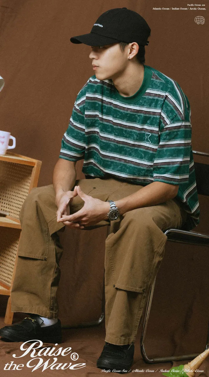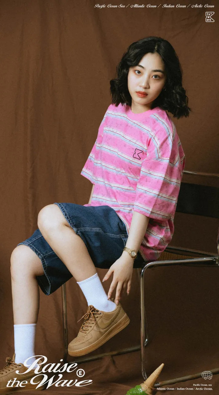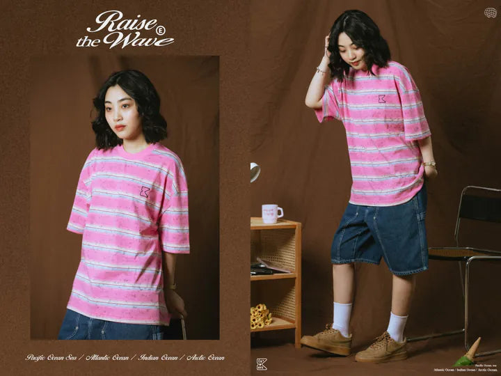 此款條紋tee採用寬版落肩版型,適合任何身型,無論是單穿或內搭都輕鬆駕馭。配色上選用低飽和的粉色與墨綠作為主調,跳脫制式條紋設計,並融入『浪花痕跡』概念,以「洗舊炒雪花」工藝重新詮釋條紋美學,打造出如浪花拍岸般的自然肌理。結合復古條紋元素,於懷舊與現代之間取得巧妙平衡,呈現輕鬆卻不失個性的夏日氛圍。細節部分,左胸口加入極簡波浪形圖騰,象徵品牌理念「Cowave = Coast + Wave」,簡潔卻充滿識別度。