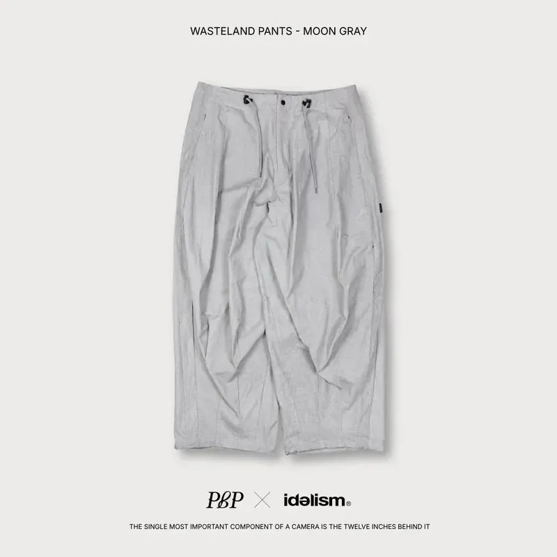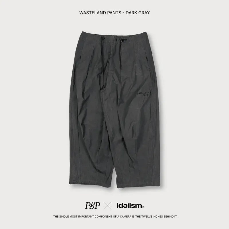 -WASTELAND PANTS -本次聯名長褲與外套採用相同面料結合寬鬆繭型輪廓上身營造更豐富有趣的視覺造型細節方面兩側配置斜插隱藏式拉鍊口袋外左側大腿處額外增加口袋設計提升日常置物空間褲腳採抽繩設計可依照喜好,自行調整輪廓最後腰部配置雙抽繩調整更方便腰圍調整.