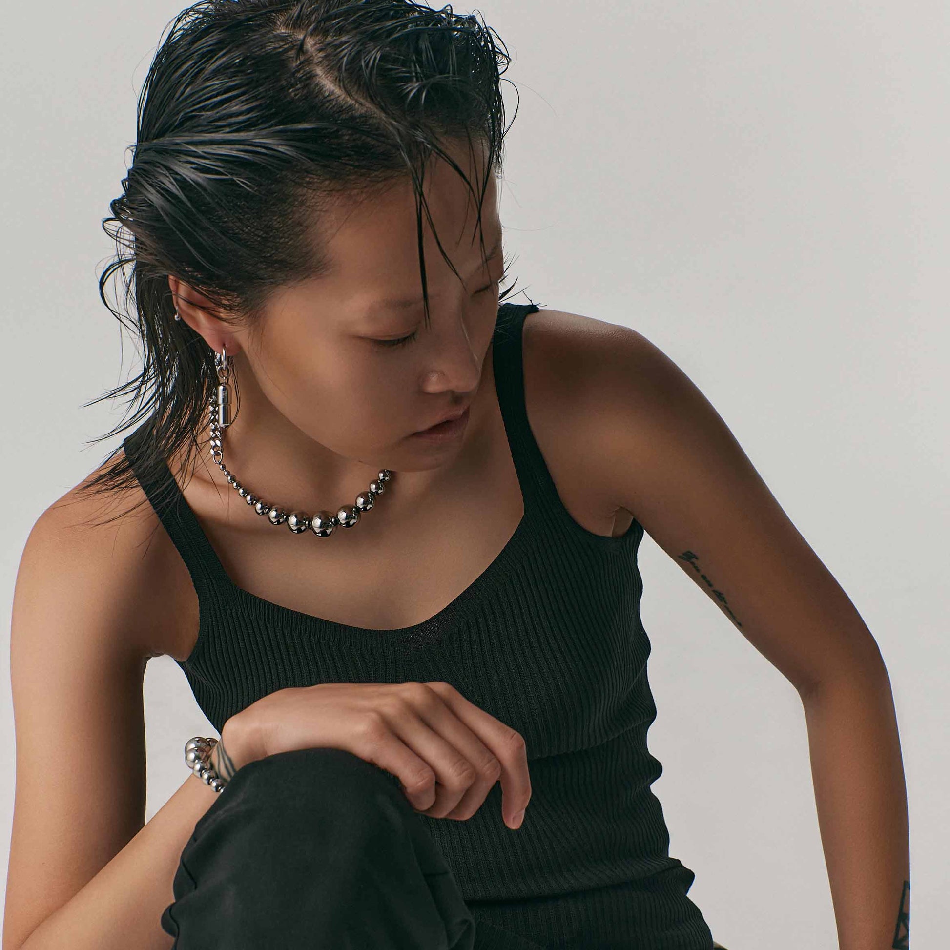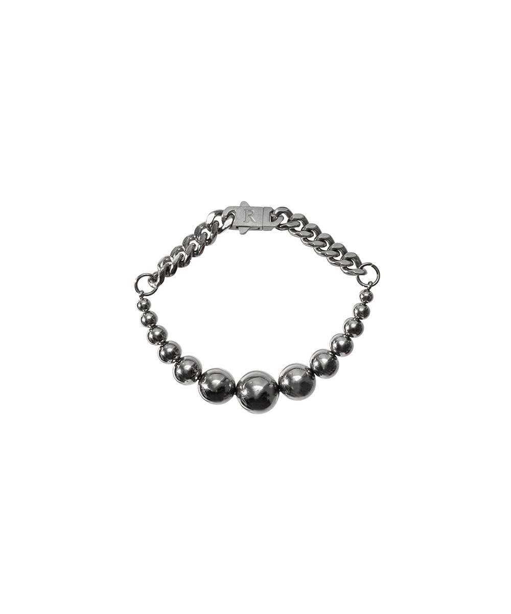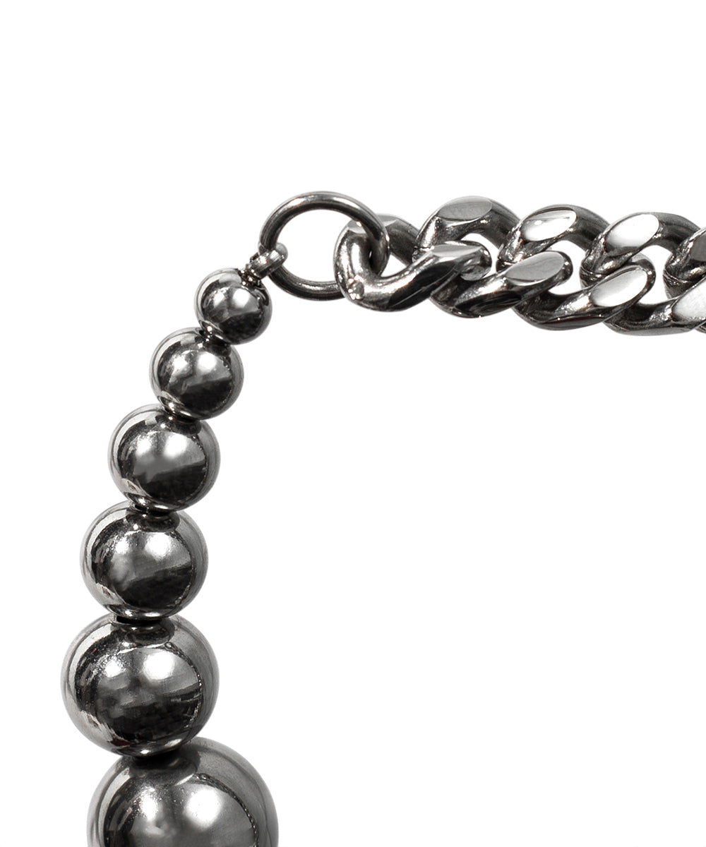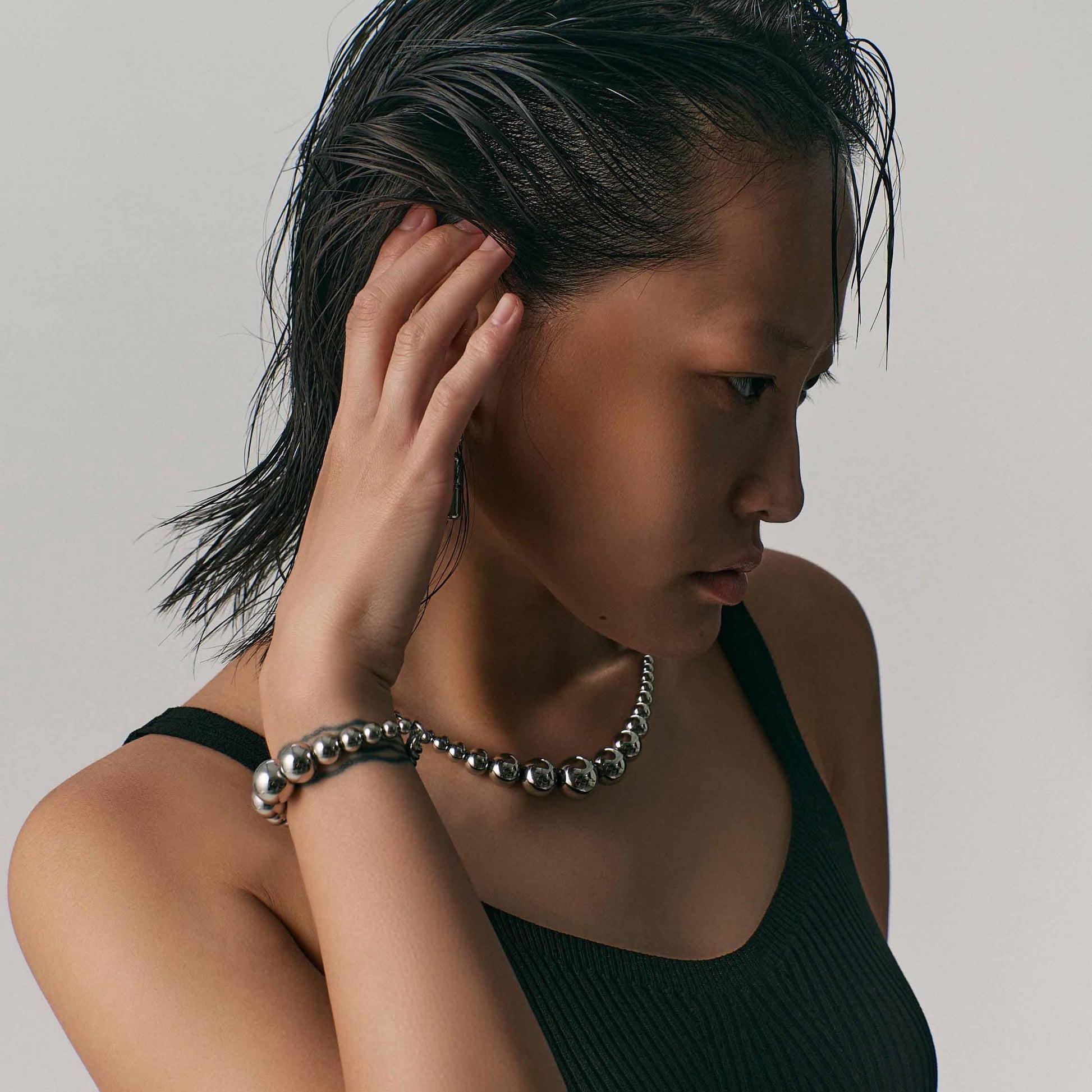 - 輔料扣具經噴砂處裡,表層的霧化呈現與柔滑手感無可取代,鋼質鍊條與球體結合,貫穿系列主軸。