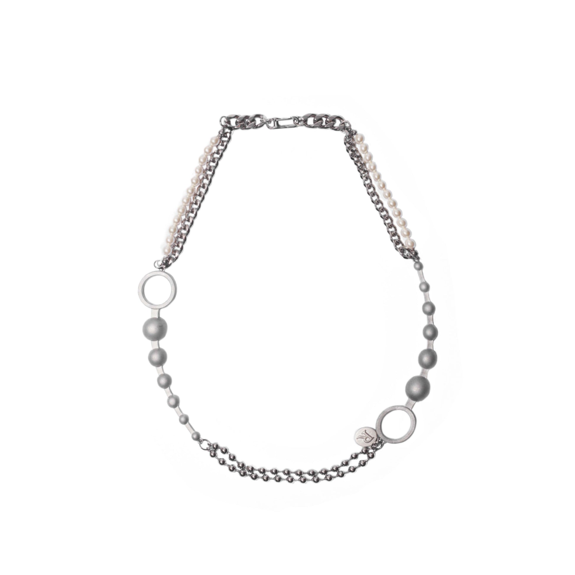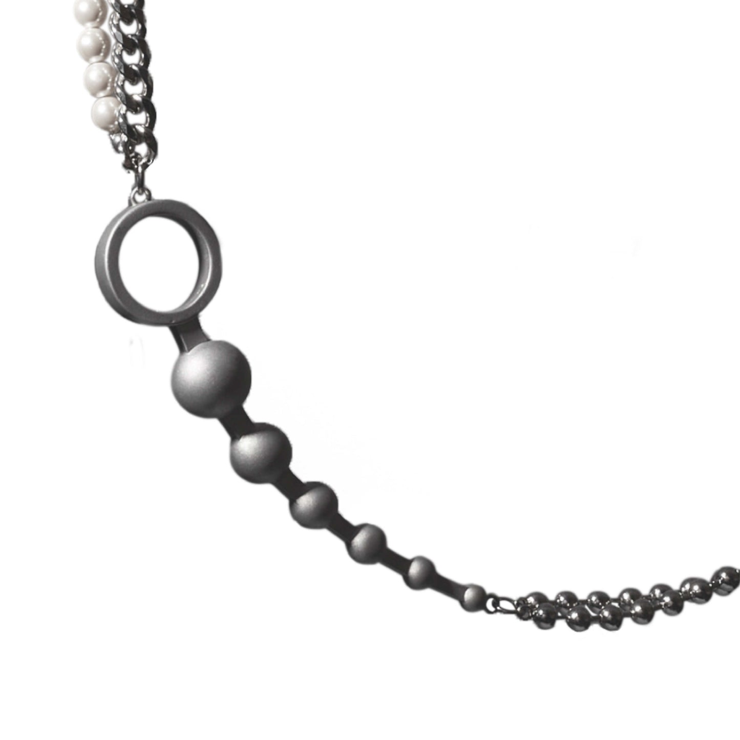 - 穿插在白潤珍珠與扁鍊之間,讓拉珠作為墜飾呈現更多層次的變化,不局限於情趣玩法,也可以是高尚優雅的點綴。