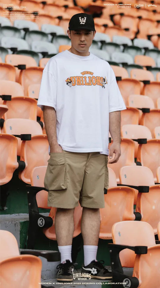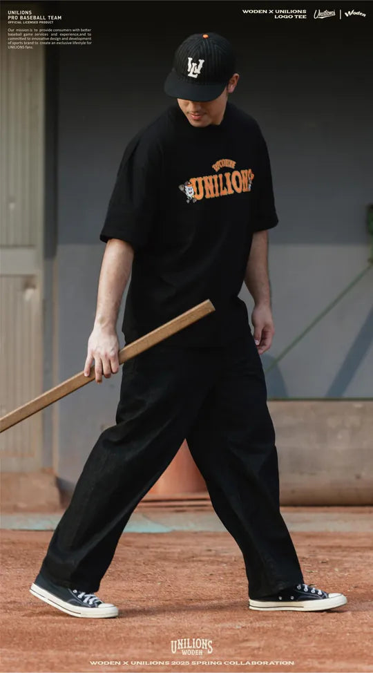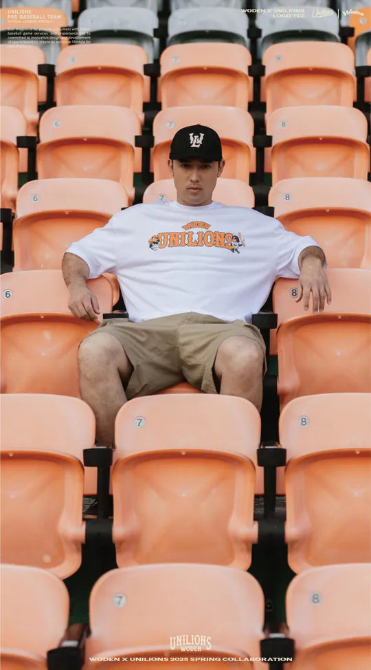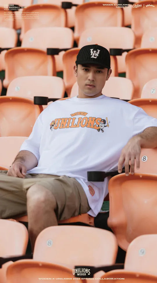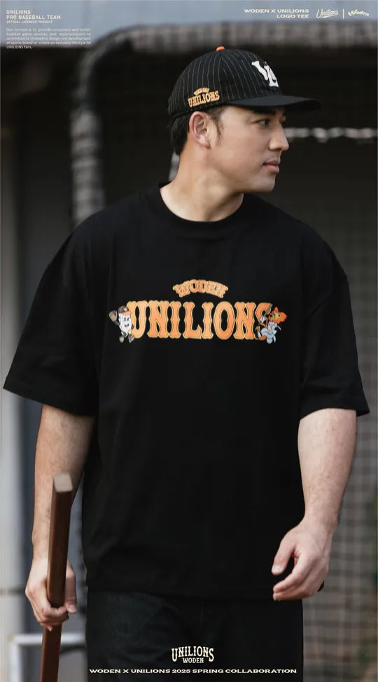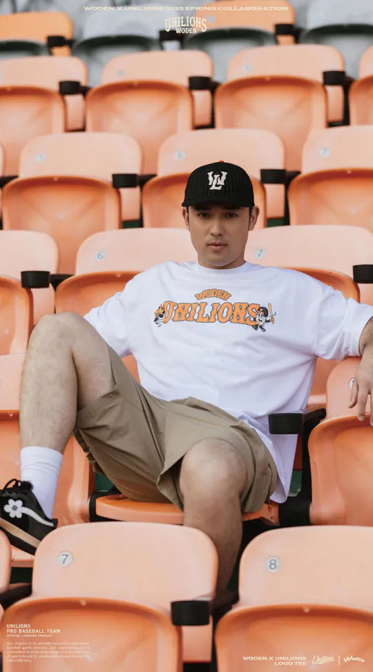 ●正面以聯名字體排版,融合 Unilions® 吉祥物「萊恩」與 WODEN®「羽毛人」的美式插畫風格,展現街頭與運動的雙重魅力。
