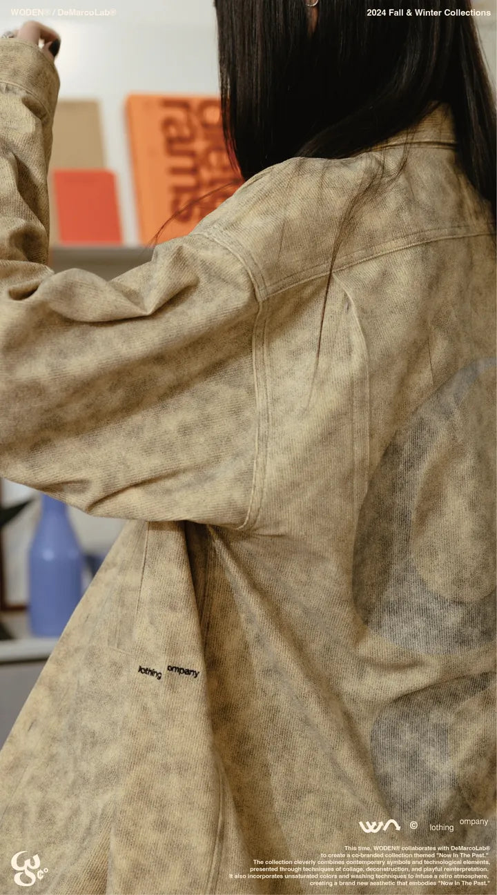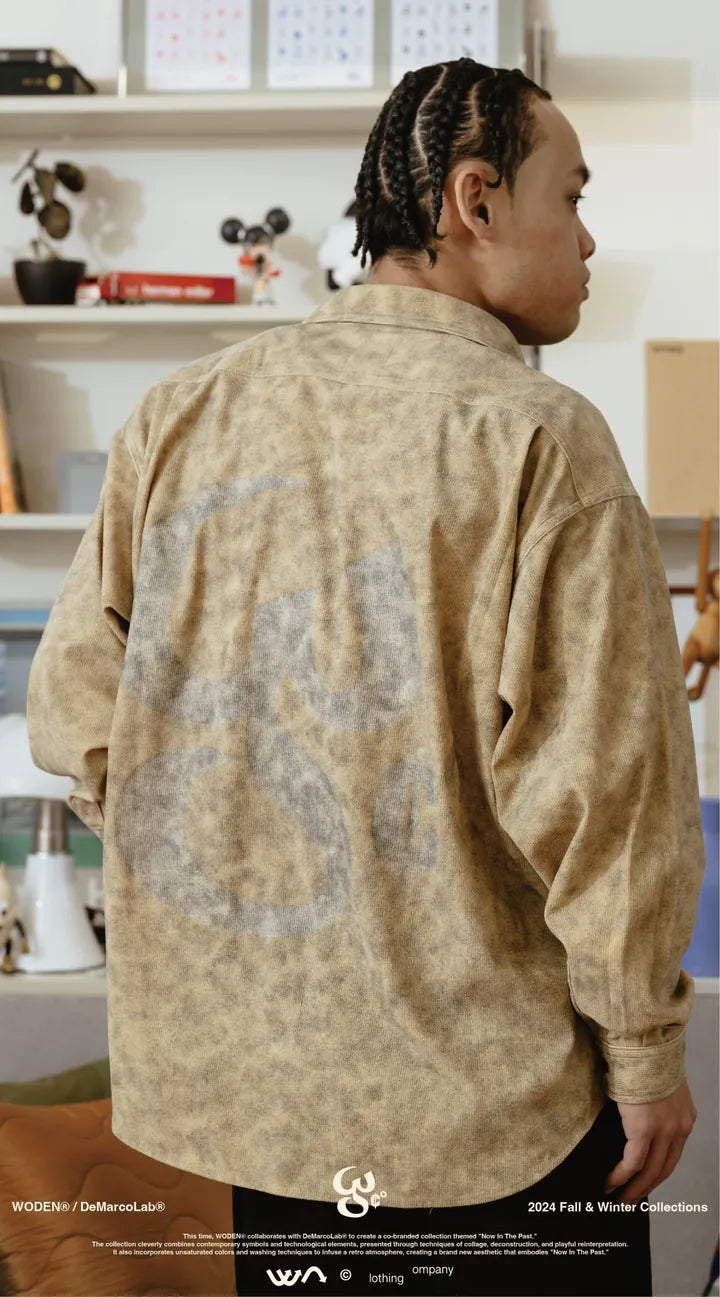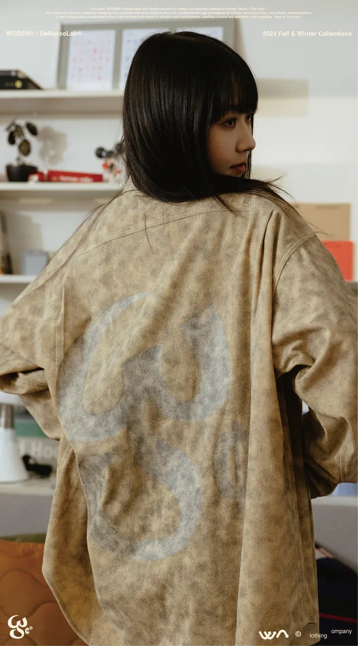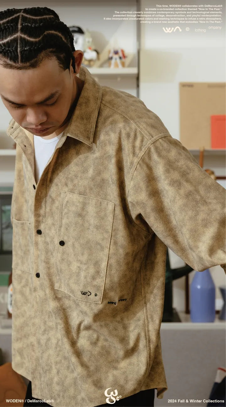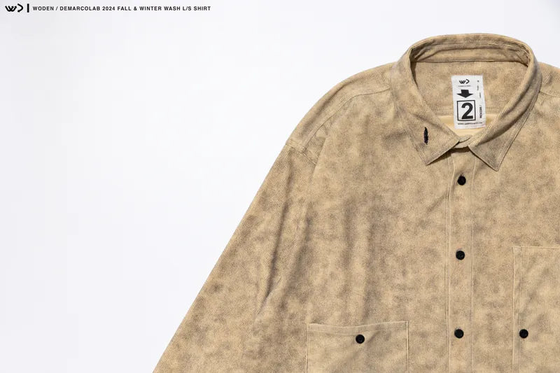 本次襯衫以營造復古氛圍為核心,採用特殊紮染洗水燈芯絨面料,呈現自然不均勻的紮染效果,搭配燈芯絨獨特的霧面光澤感,整體風格豐富且層次分明,展現細膩的質感美學。