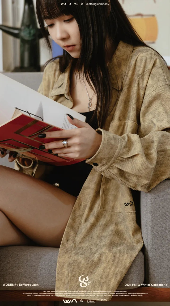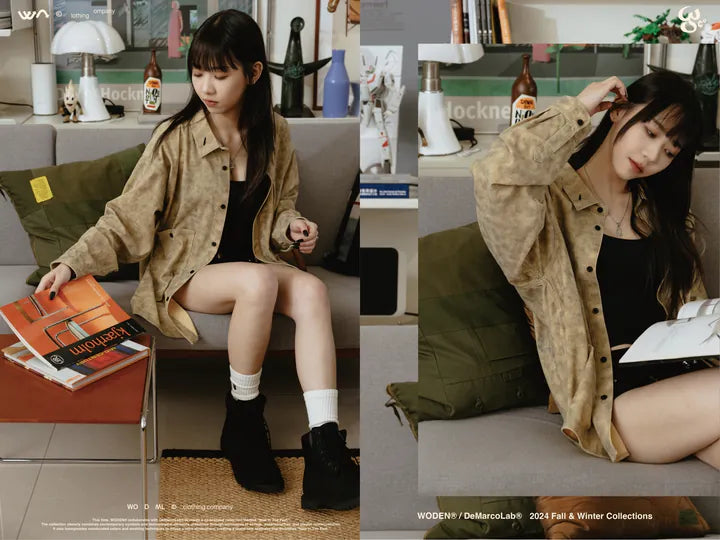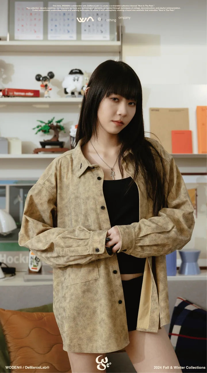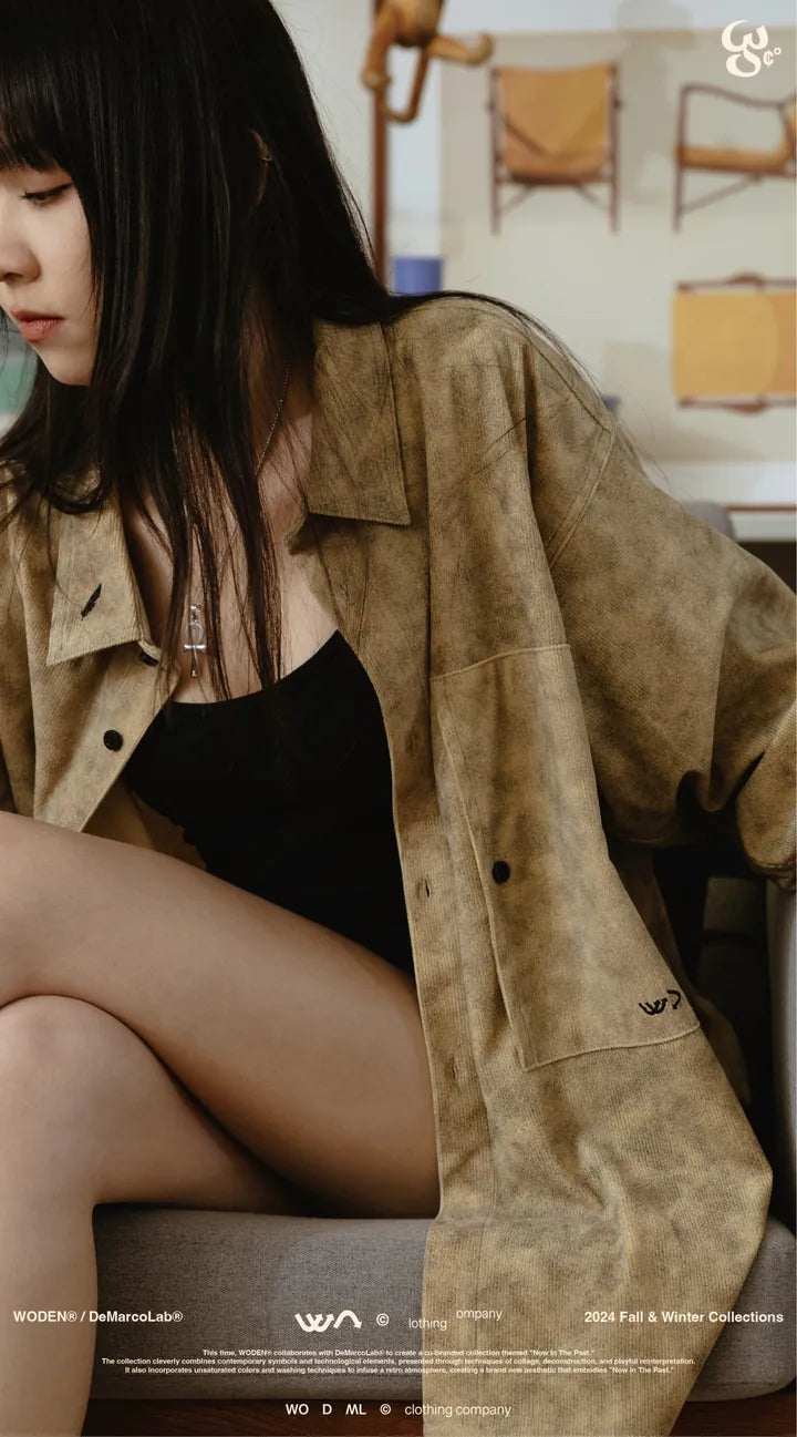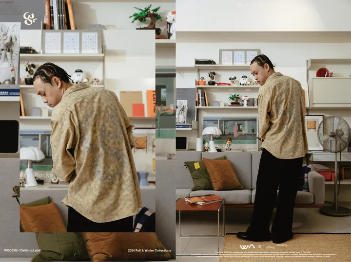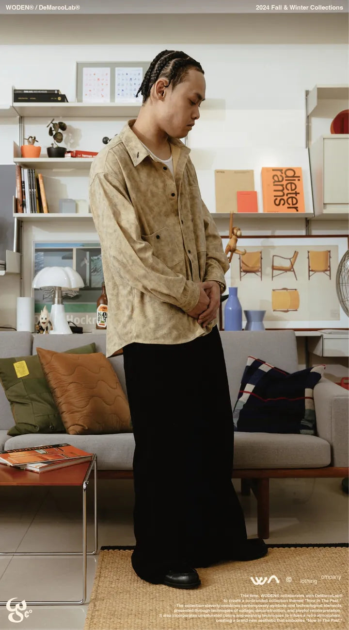本次襯衫以營造復古氛圍為核心,採用特殊紮染洗水燈芯絨面料,呈現自然不均勻的紮染效果,搭配燈芯絨獨特的霧面光澤感,整體風格豐富且層次分明,展現細膩的質感美學。