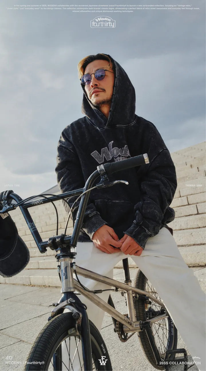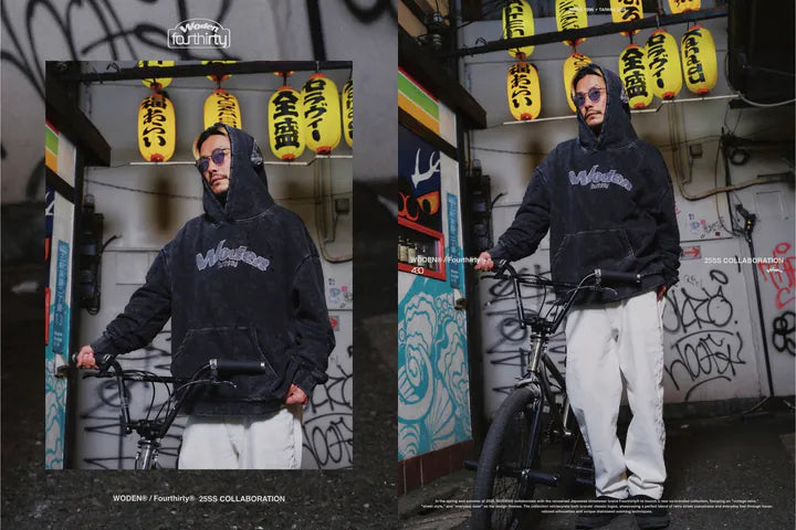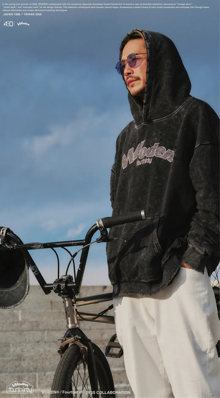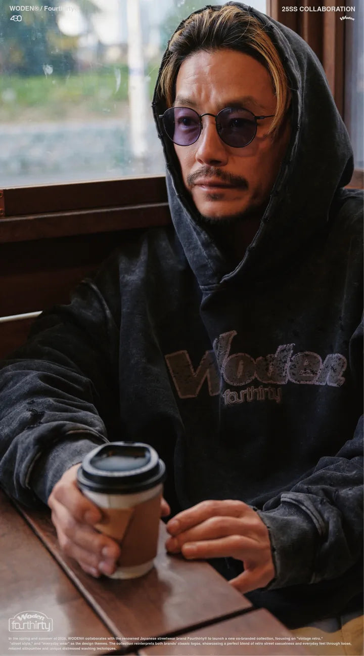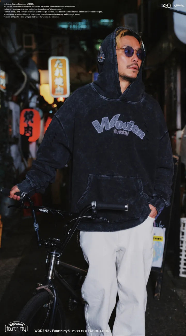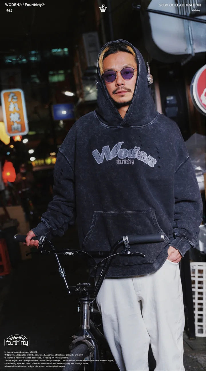 このフーディーは、WODEN® のレトロスタイルと Fourthirty® のストリートスタイルを融合させたデザインです。
