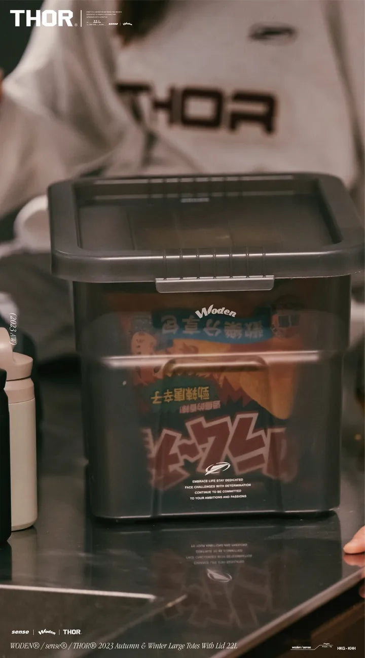 攜手收納品牌THOR®共同開發設計,強調本次聯名主軸『生活』。收納箱選擇大小適中的22L,搭配透明黑作為主體顏色,分別於正反面、側面、蓋子和底部加入本次合作印花排版,使箱子細節更加豐富。
