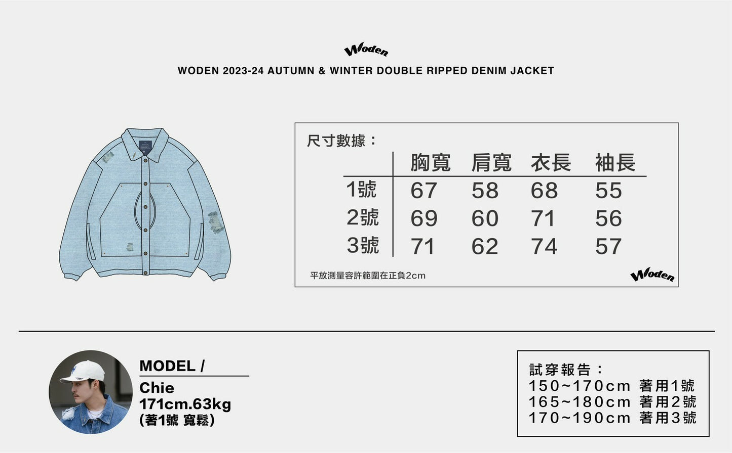 使用10oz牛仔布,不至於過於厚重且因應台灣氣候。細節處理上以刷色洗水工法,搭配局部破壞手法,呈現單品的復古舊化感。單寧面料以重水洗工法使整體視覺感更有氛圍,拼接銜接處採用褪色處理手法,讓整體更加有層次感。