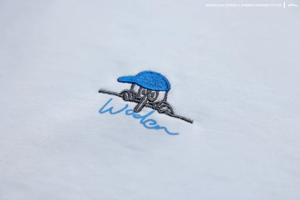 正面小木偶頭像,以精密電繡呈現,下方手寫woden字樣,手寫風格增加圖像隨性和童趣,與小木偶的形象相呼應。