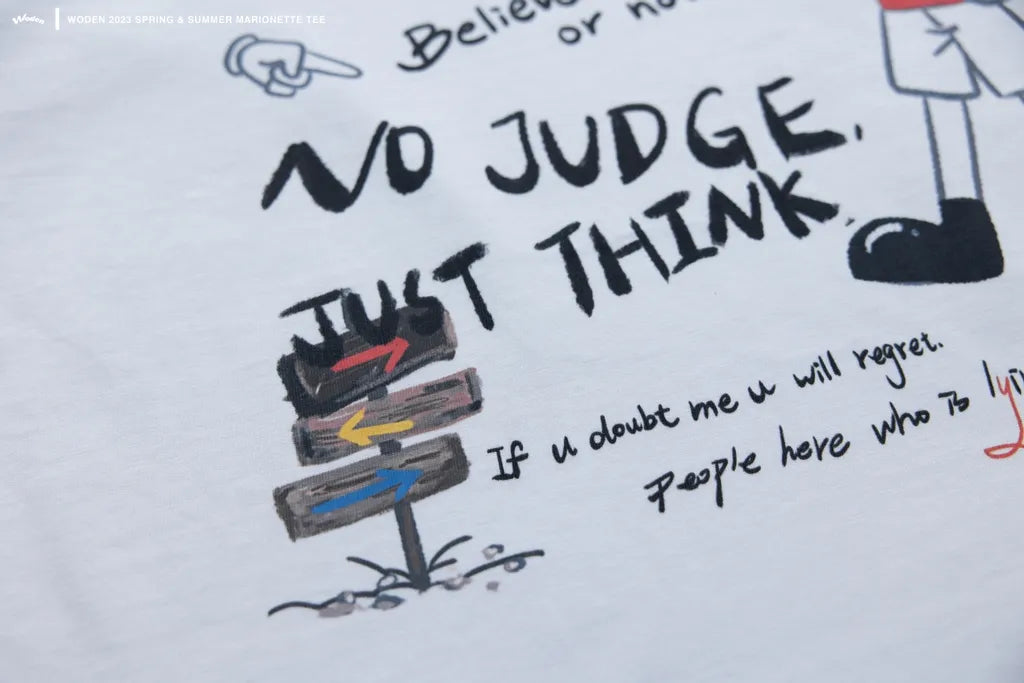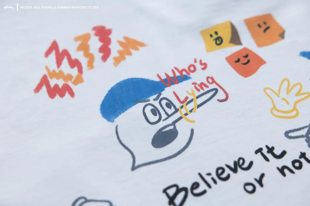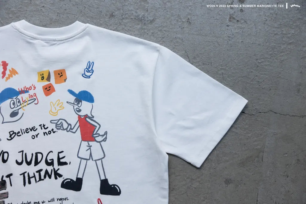 此款T-shirt 以童話故事『小木偶』作為主題繪製,將小木偶圖像以幽默逗趣的塗鴉風格呈現。