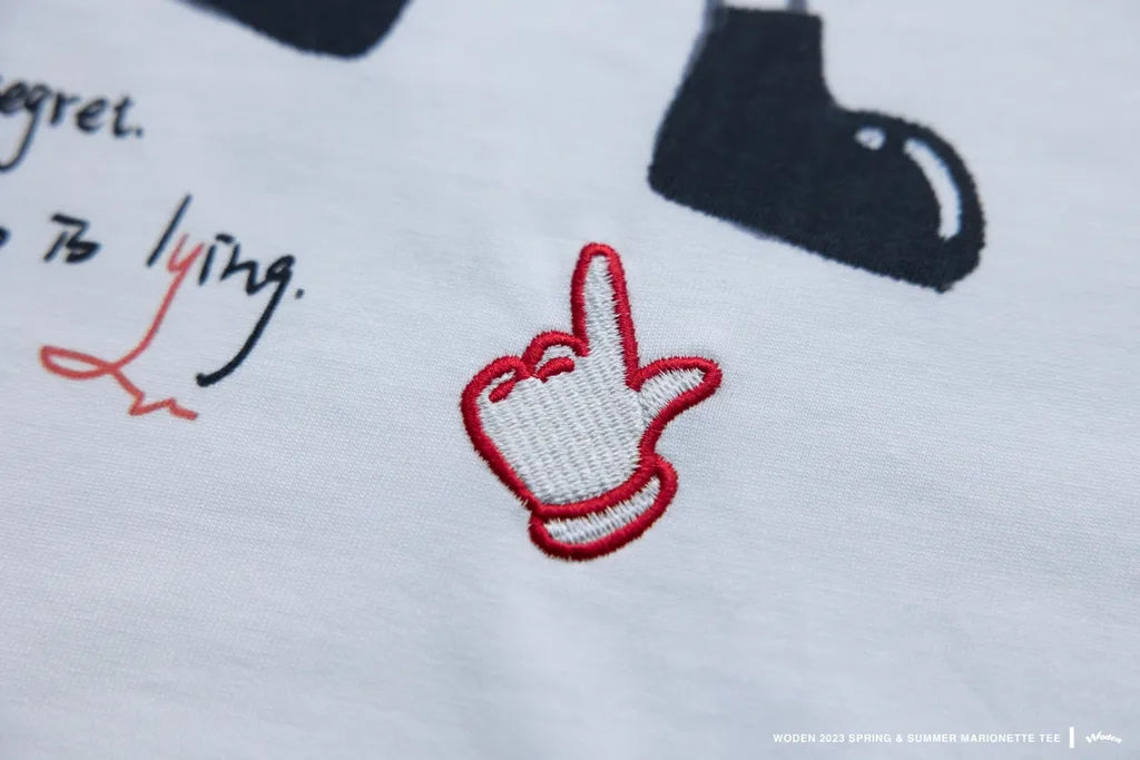 背面大圖可以看到小木偶人像及手繪元素結合,圖中文字內容以手繪描寫出小木偶故事中的『說謊』情節,使用直噴印刷呈現此細節。其中圖案中的划拳圖騰,特別是呼應飲酒划拳時,對手心中的猜忌謊言試圖破解取得勝利✌🏼。此細節特別以電繡方式呈現,此細節使圖案更加層次。