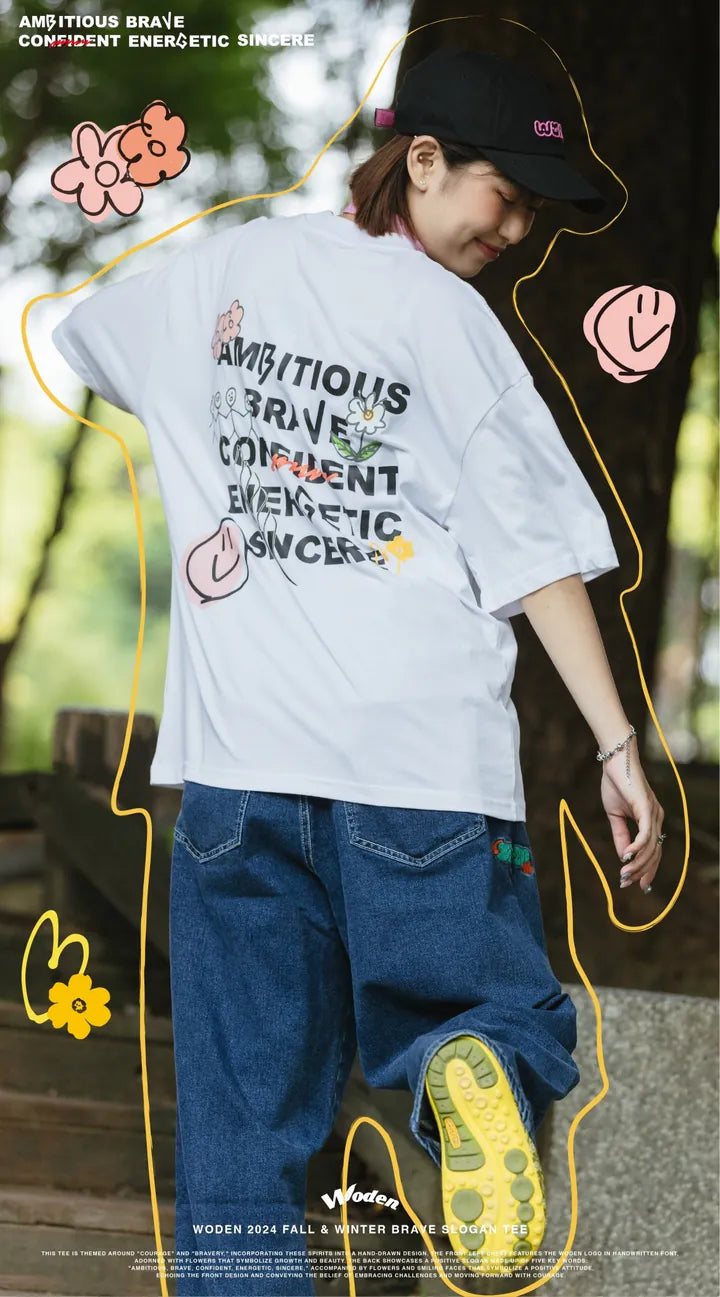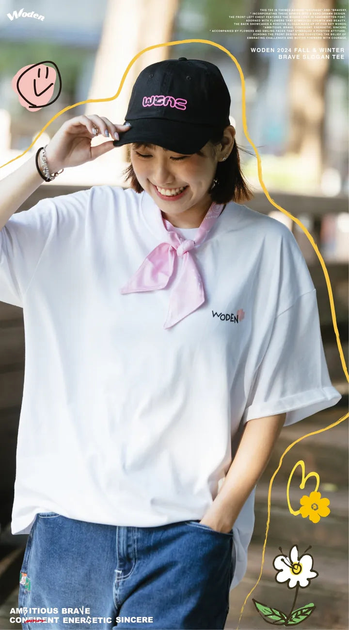 此款短Tee以「勇氣」與「勇敢」為主題,將這些精神融入手繪設計中。正面左胸口以手寫字體呈現 WODEN 標誌,並點綴花朵,象徵成長與美好。背面則以「Ambitious、brave、confident、energetic、sincere」五個關鍵詞組合正向標語,搭配象徵積極態度的花朵和笑臉,與正面圖案相呼應,傳遞迎接挑戰、勇敢向前的信念。