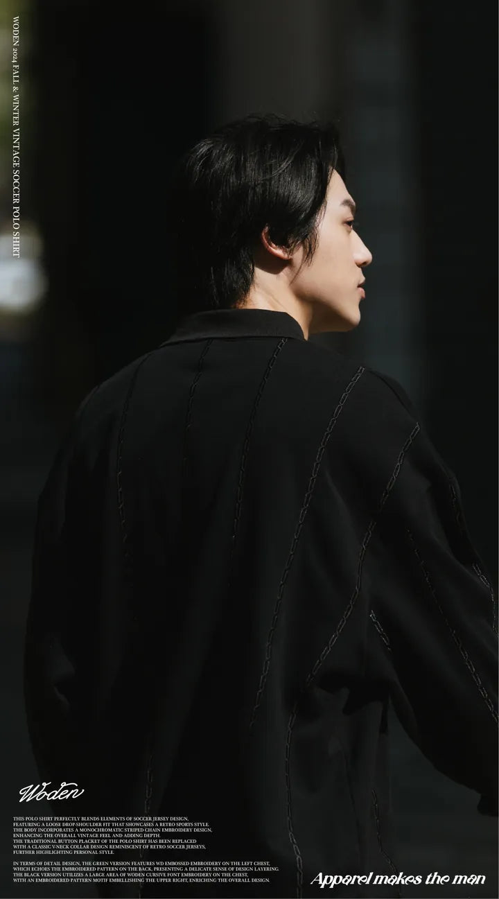 此款POLO衫完美融合足球衫設計元素,採用寬鬆落肩版型,展現復古運動風格。衣身加入同色系的直條鏈條電繡設計,提升了整體復古感也更有層次。領口取消了傳統POLO衫的排釦,改為復古足球衫經典的V領搭配領子設計,更突顯個人風格。