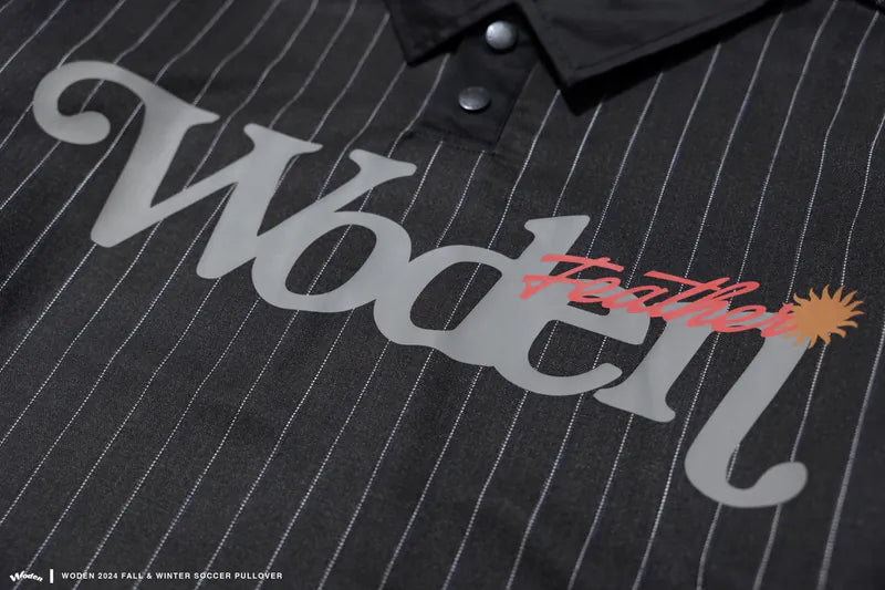 此款罩衫巧妙結合足球衣設計元素,以滿版直條紋呈現,營造濃厚的復古氛圍。正面搭配雕花風格的 WODEN 字體印花,不僅增添細節,也強化品牌辨識度。同時,保留經典的足球衣領與排釦設計,不僅提升穿搭層次感,亦兼具實穿性與方便性。下擺加入可調節鬆緊帶設計,讓版型更具靈活性,穿著效果更加寬鬆俐落。