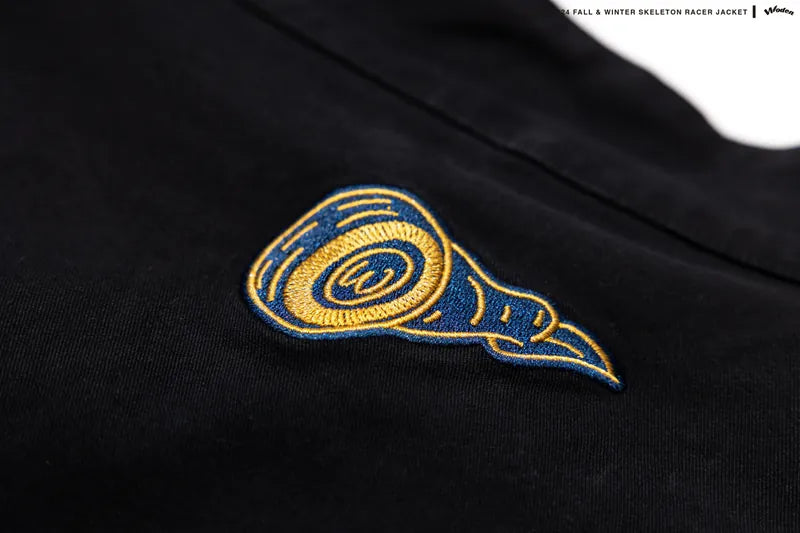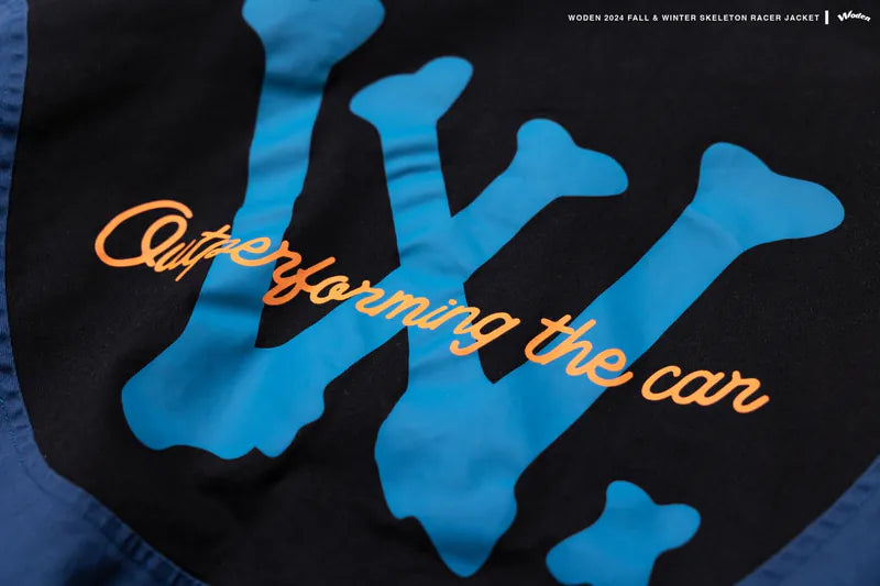 本季賽車外套注入全新骷髏元素,於正面大膽融入骨架設計,袖部則加入骨頭排列細節,並採用雷射割型貼布工藝,呈現層次分明的立體效果。細節部分,胸前搭配扭曲的 WODEN 字體電繡設計,並於胸口與下擺加入電繡徽章細節,賦予外套更高的辨識度。