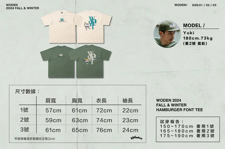 正面採用字體排版設計,胸前加入手寫字體並疊加撞色的W字元素,營造出豐富的立體視覺效果。背面則以WODEN堆疊字體排版呈現,配色與正面胸口字體互相呼應,旁邊則搭配風趣又無厘頭的『漢堡人』圖像,讓整體更加生動有趣。