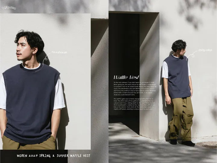 在炎熱的夏季,如果不想只穿一件T-shirt出門,增加層次感的最佳選擇非外搭背心莫屬!眾多背心種類中,透氣且柔軟的Waffle華夫格套頭背心絕對是日常百搭的不二之選。無論搭配短Tee還是襯衫,都能輕鬆展現個人風格。