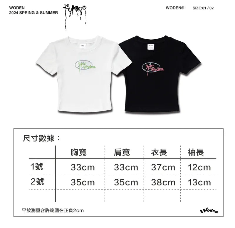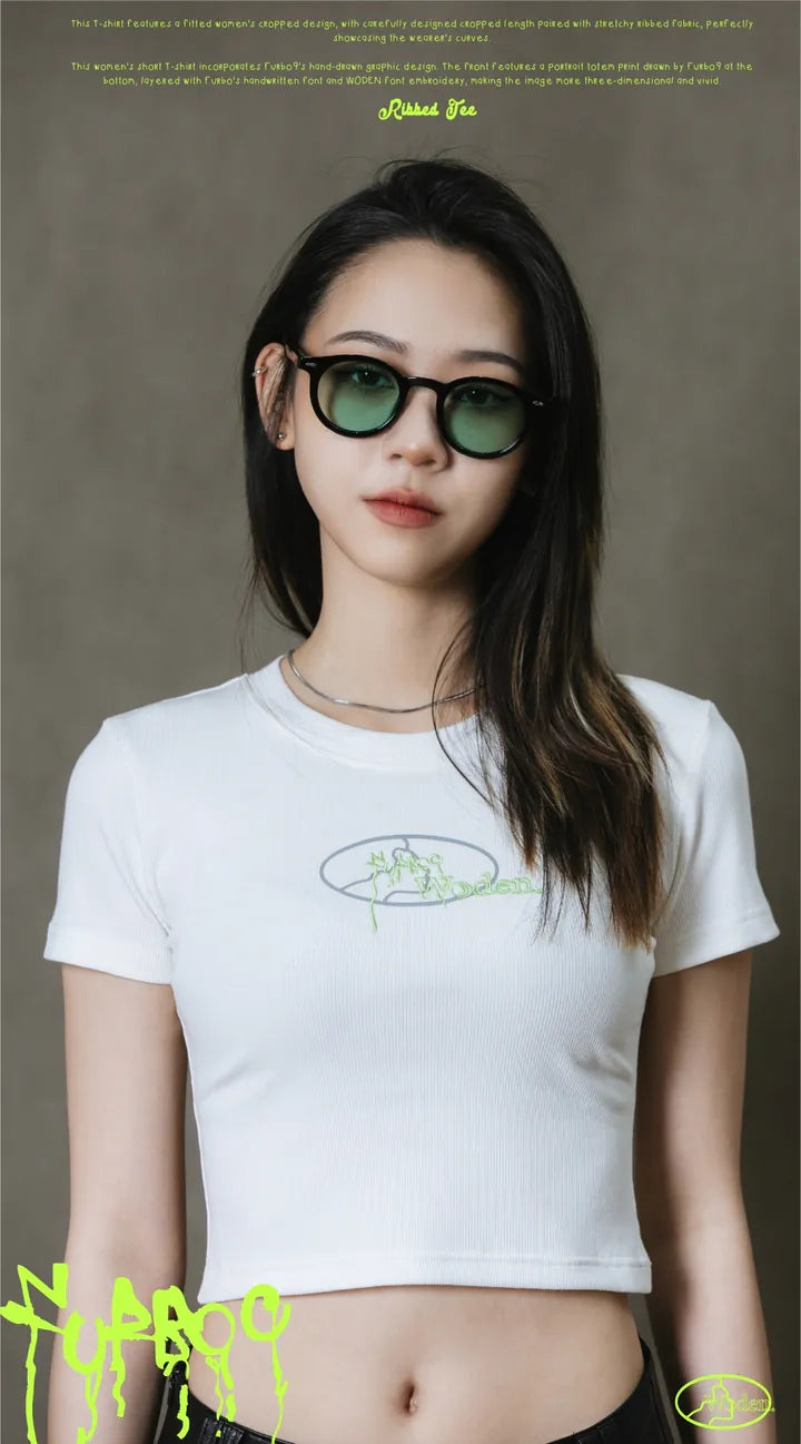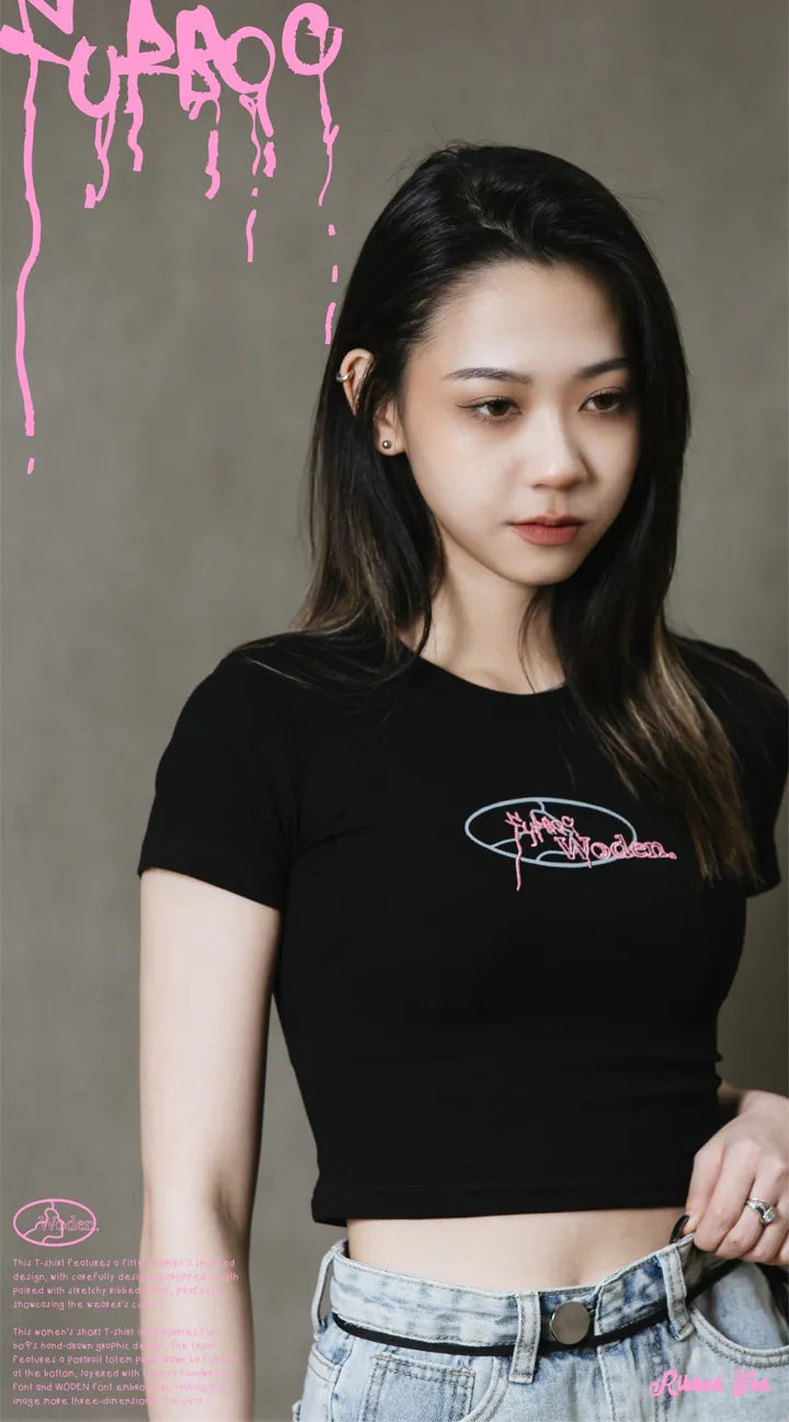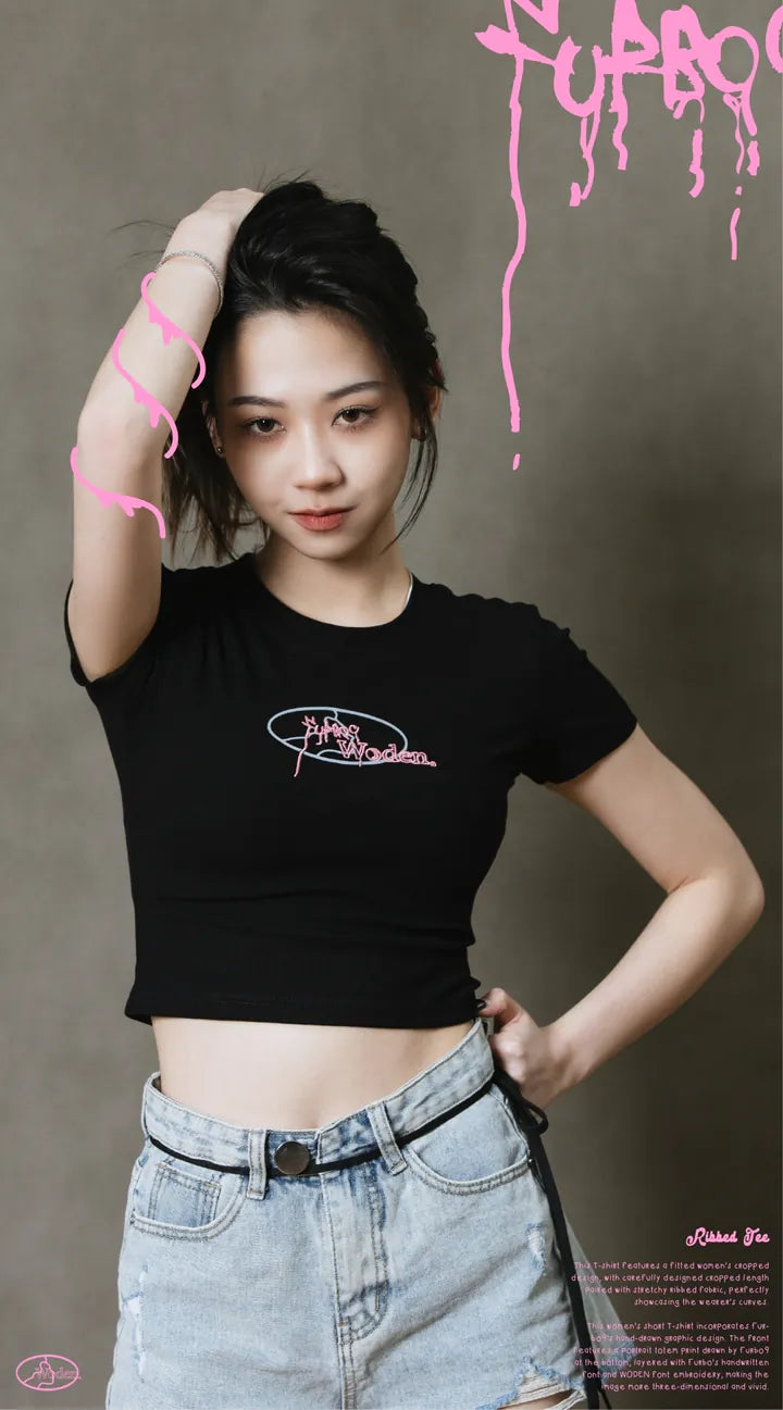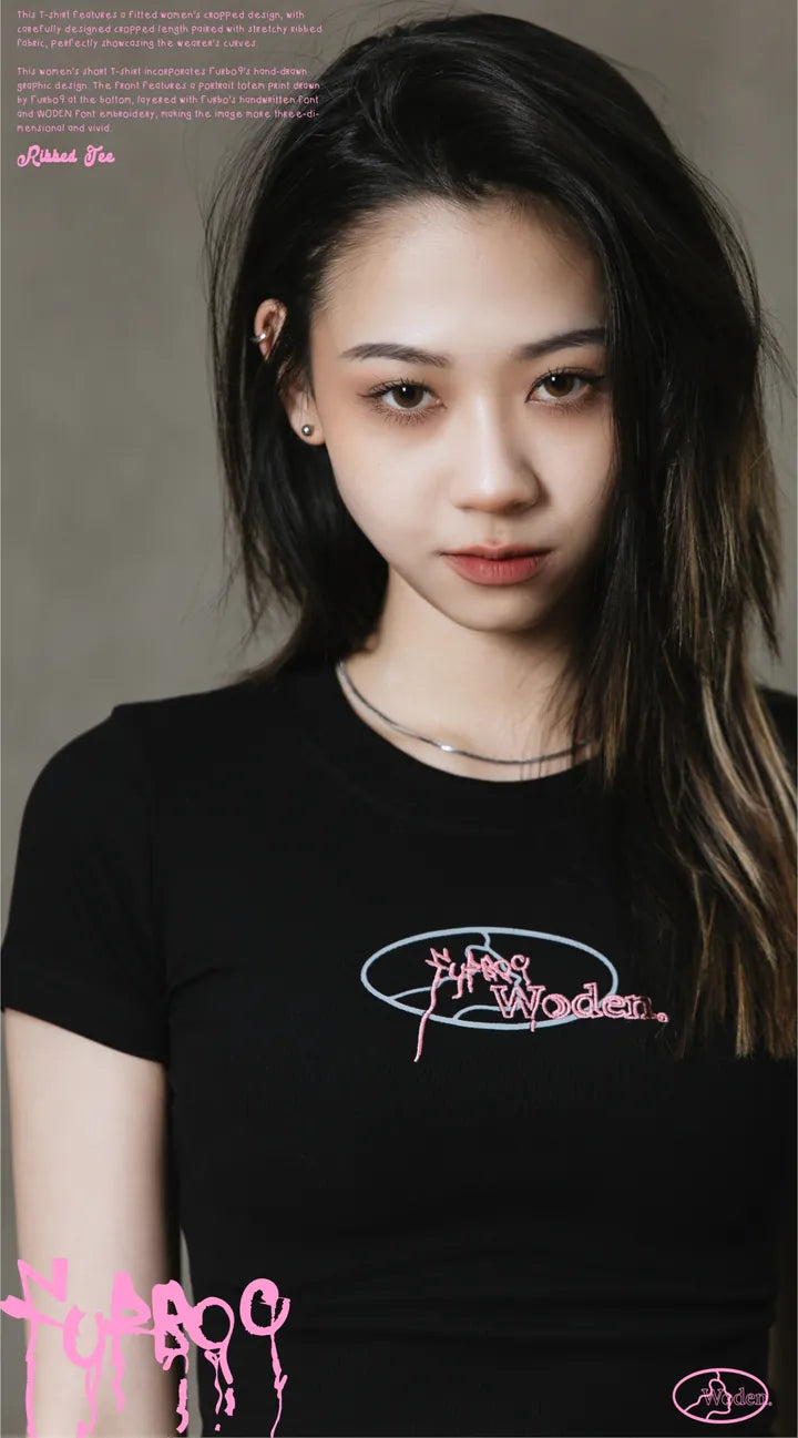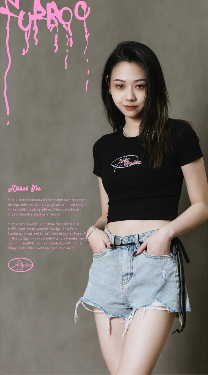 此款女短版T-shirt融入了Furbo9的手繪圖像設計,正面圖底部以Furbo9繪製的人像圖騰印花呈現,再疊加Furbo手寫字體和WODEN字體的電繡工藝,使圖像更加立體生動。