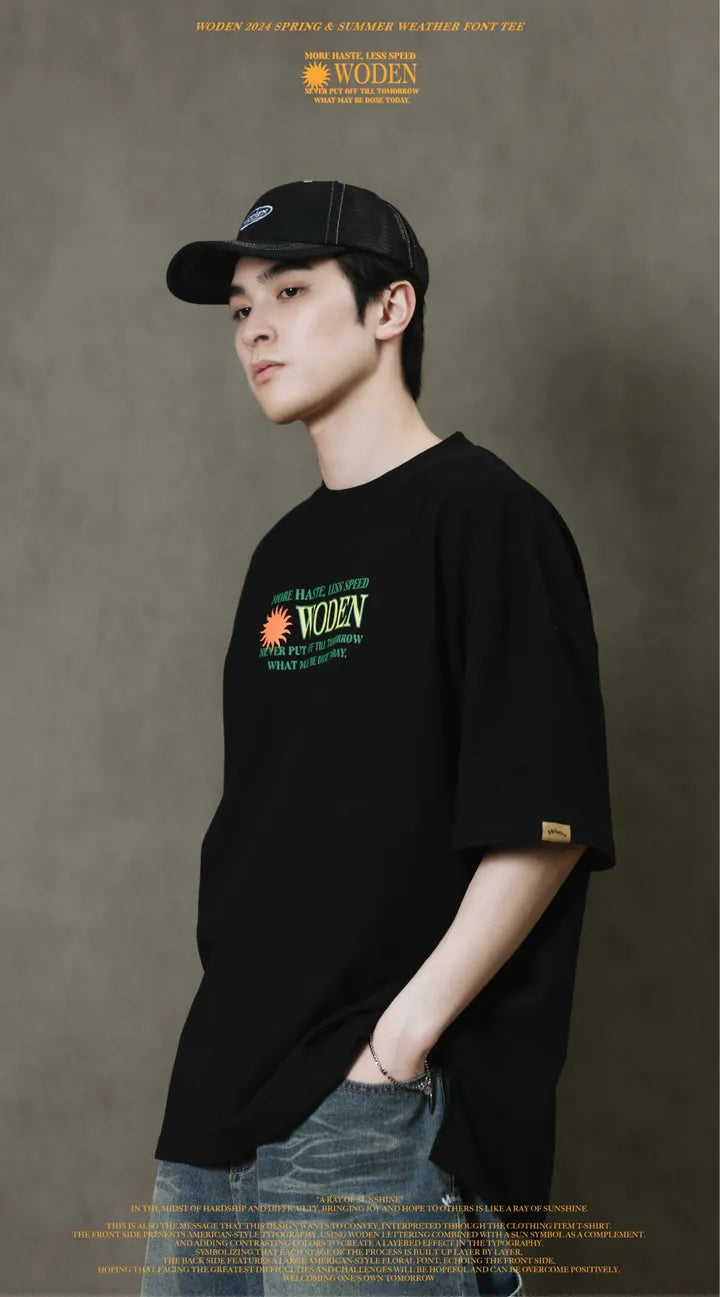 這也是此款想要傳達的信息,透過服飾單品_T-shirt來做詮釋。正面以美式排版文字呈現,利用WODEN字母排版加入太陽圖騰作為呼應,再以撞色使排版更有層次感。象徵著每個過程階段都一次相互堆疊而成,背面加入大圖美式雕花字體,與正面互相呼應,期許自己面對最大的困難、難關,都是有希望迎刃而解的,正向迎接屬於自己的明日。