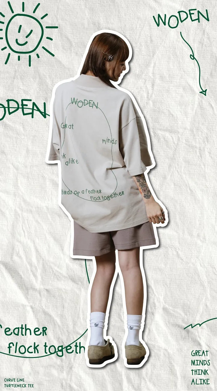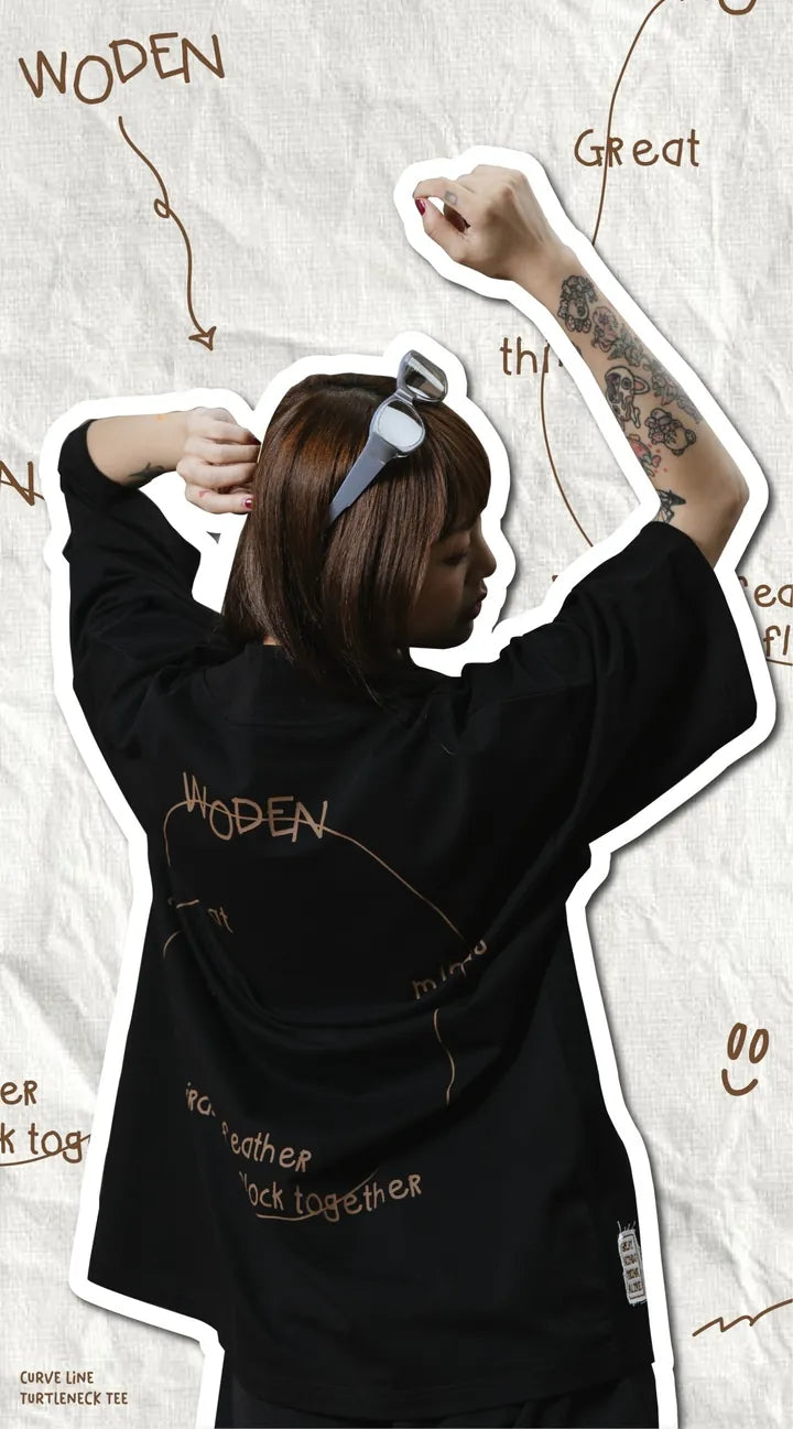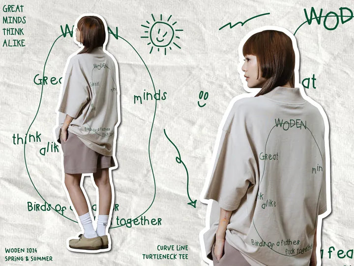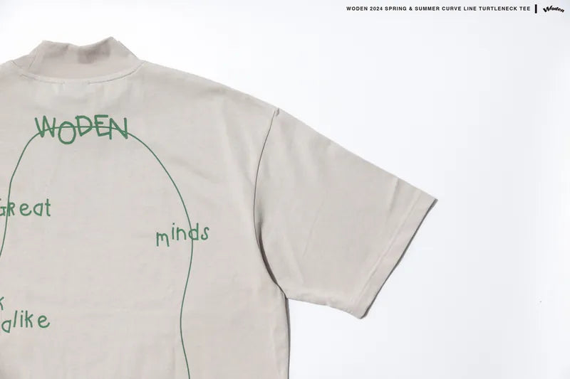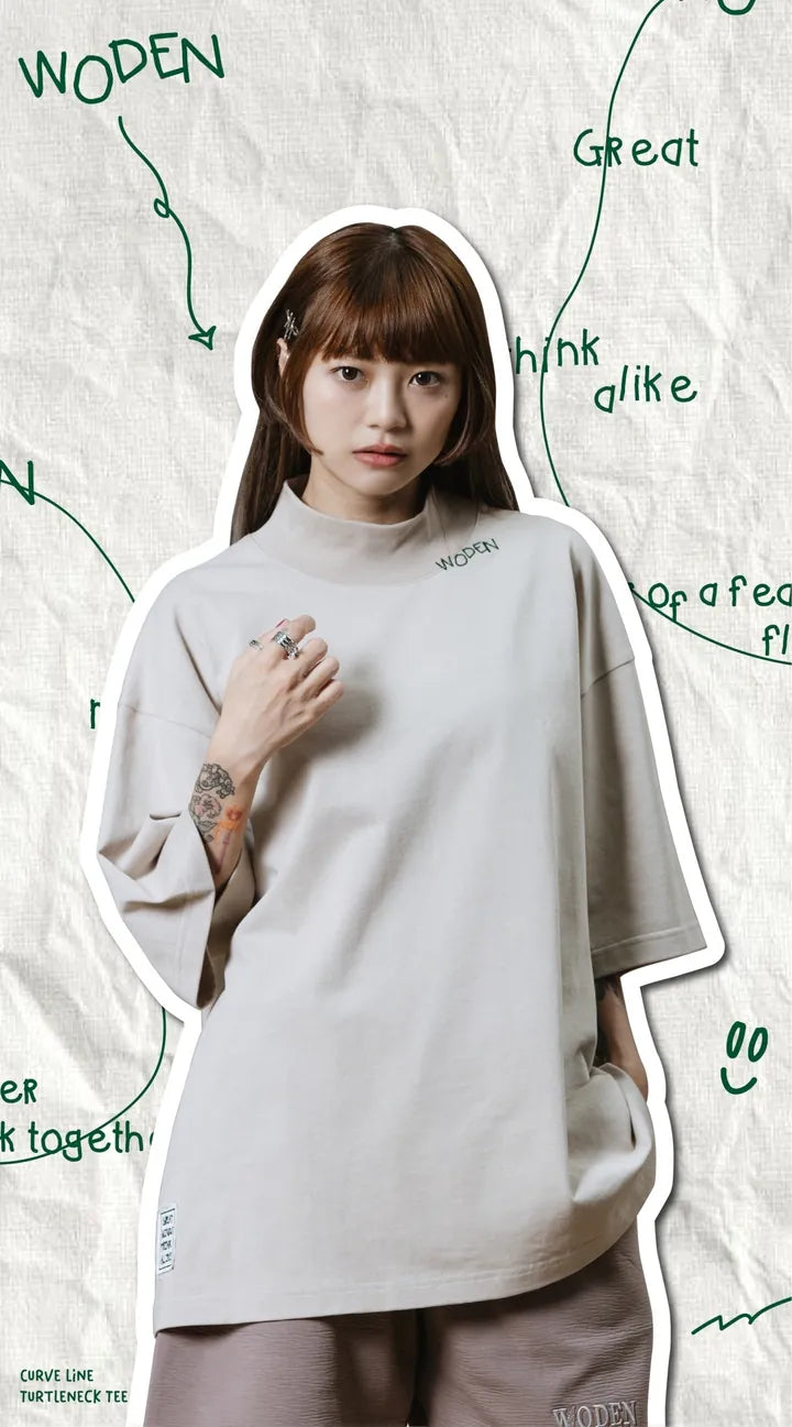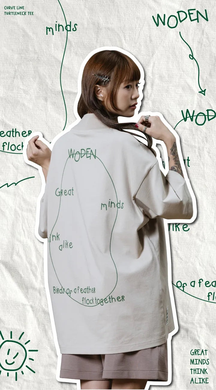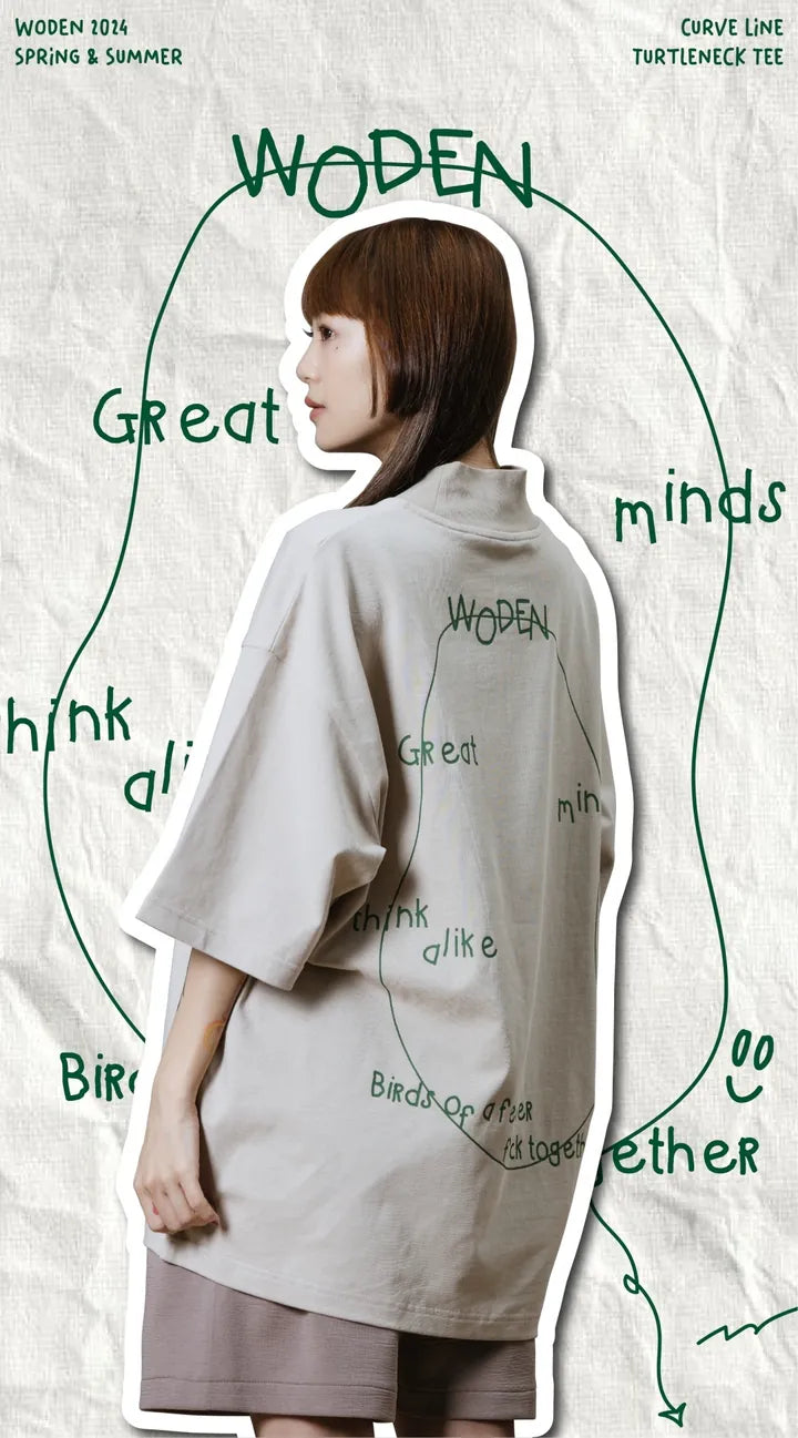 此款高領Tee以簡約風格呈現,並以手寫文字作為主視覺。細節部分,於正面領子羅紋處加入電繡WODEN手寫字體,右下擺則搭配不收邊布塊,並疊上手寫文字Slogan繡花呈現。背面則加入手繪線條和文字印花,與正面領口的手寫字體互相呼應,整體簡約但不失豐富細節。