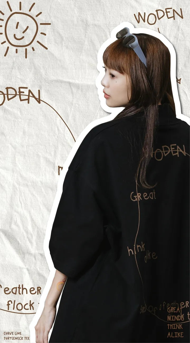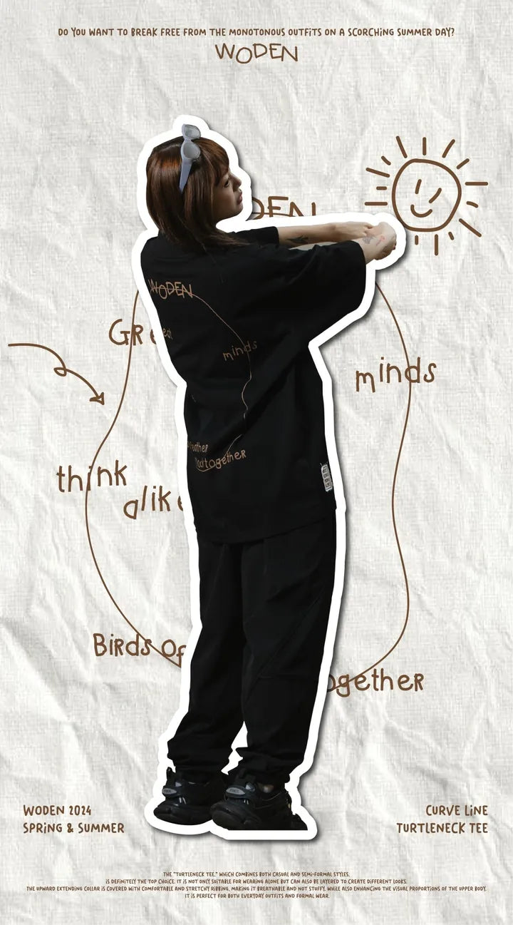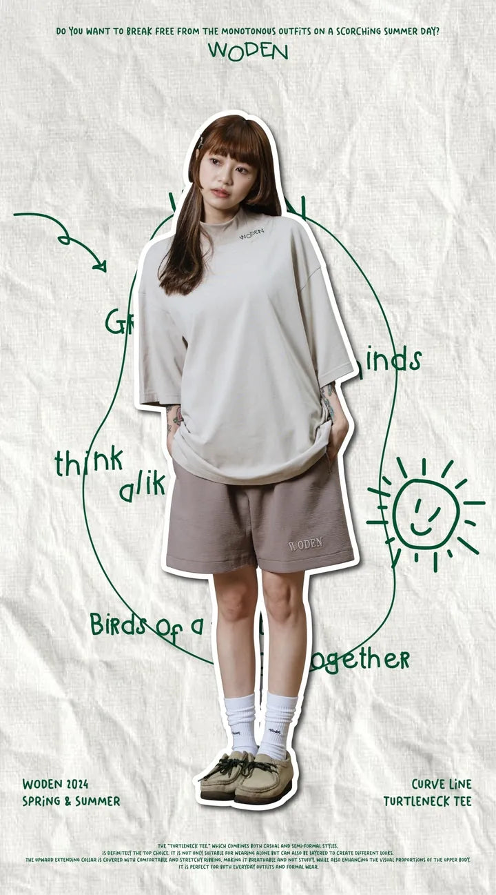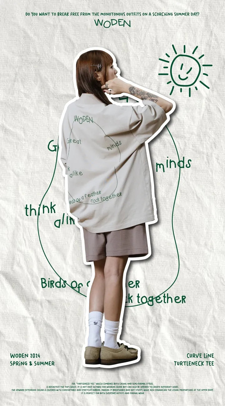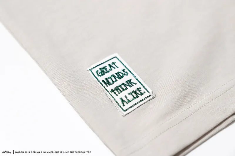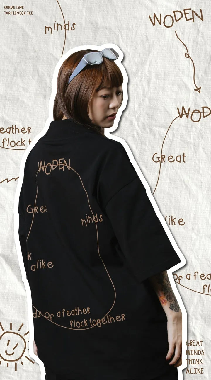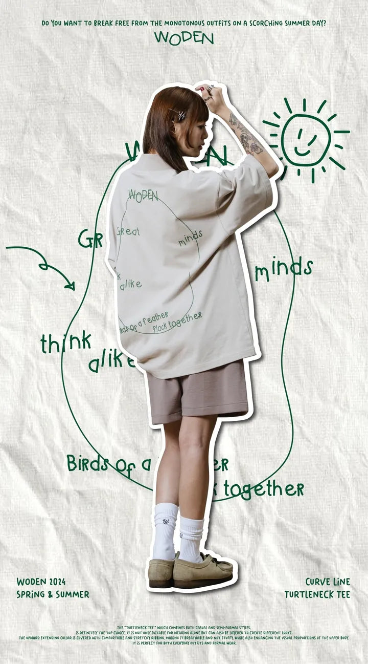 此款高領Tee以簡約風格呈現,並以手寫文字作為主視覺。細節部分,於正面領子羅紋處加入電繡WODEN手寫字體,右下擺則搭配不收邊布塊,並疊上手寫文字Slogan繡花呈現。背面則加入手繪線條和文字印花,與正面領口的手寫字體互相呼應,整體簡約但不失豐富細節。