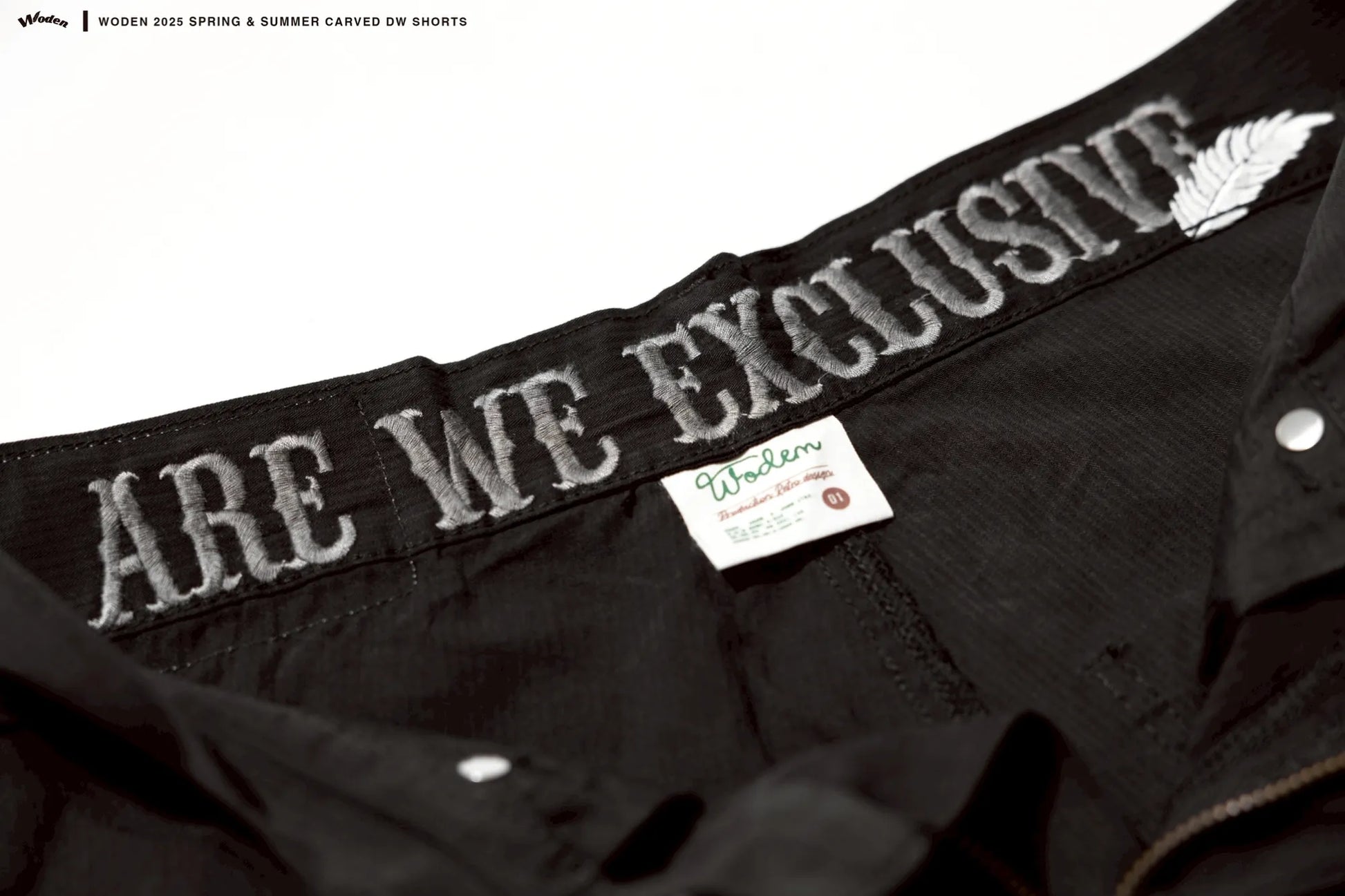 本次設計以寬鬆剪裁的「膝下五分工作褲」為主軸,選用獨特人字紋工作面料,低調中蘊含質感,讓整體視覺更顯層次。細節方面,褲身正面右口袋下方綴有DW雕花LOGO電繡,內腰則繡有『ARE WE EXCLUSIVE』雕花字樣,細膩呼應品牌理念。
