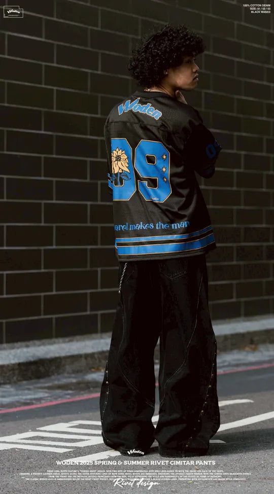 面料選用15oz重磅黑色丹寧布,挺度十足,完美支撐彎刀剪裁。搭配酵素洗處理,讓割線拼接處自然呈現色落層次,使整體視覺更具質感與深度。