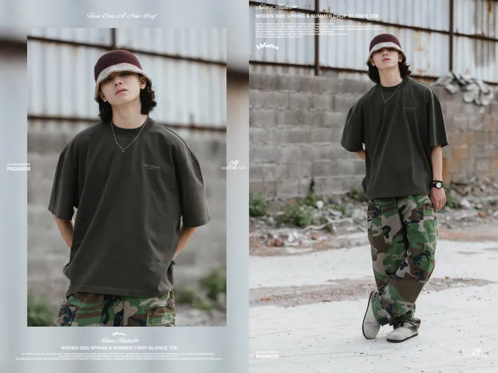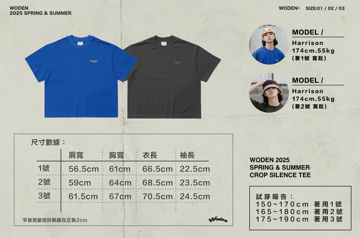 此款T-shirt以「沉默是金」文字排版為主題,版型採用超寬短版剪裁設計,衣長較WODEN標準版型短8公分,搭配傘狀寬鬆輪廓,巧妙修飾身形比例,打造俐落、簡約卻不失份量的輪廓感,更貼近亞洲身形特質。