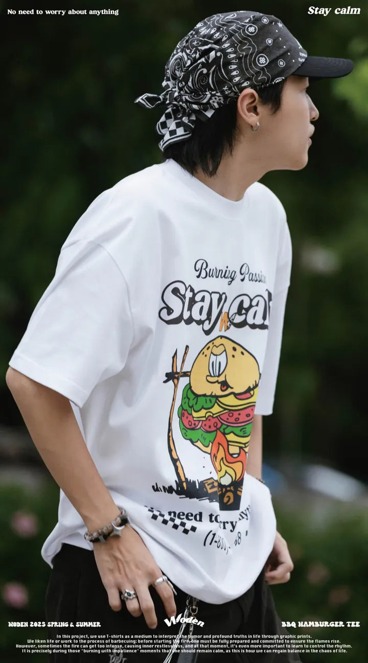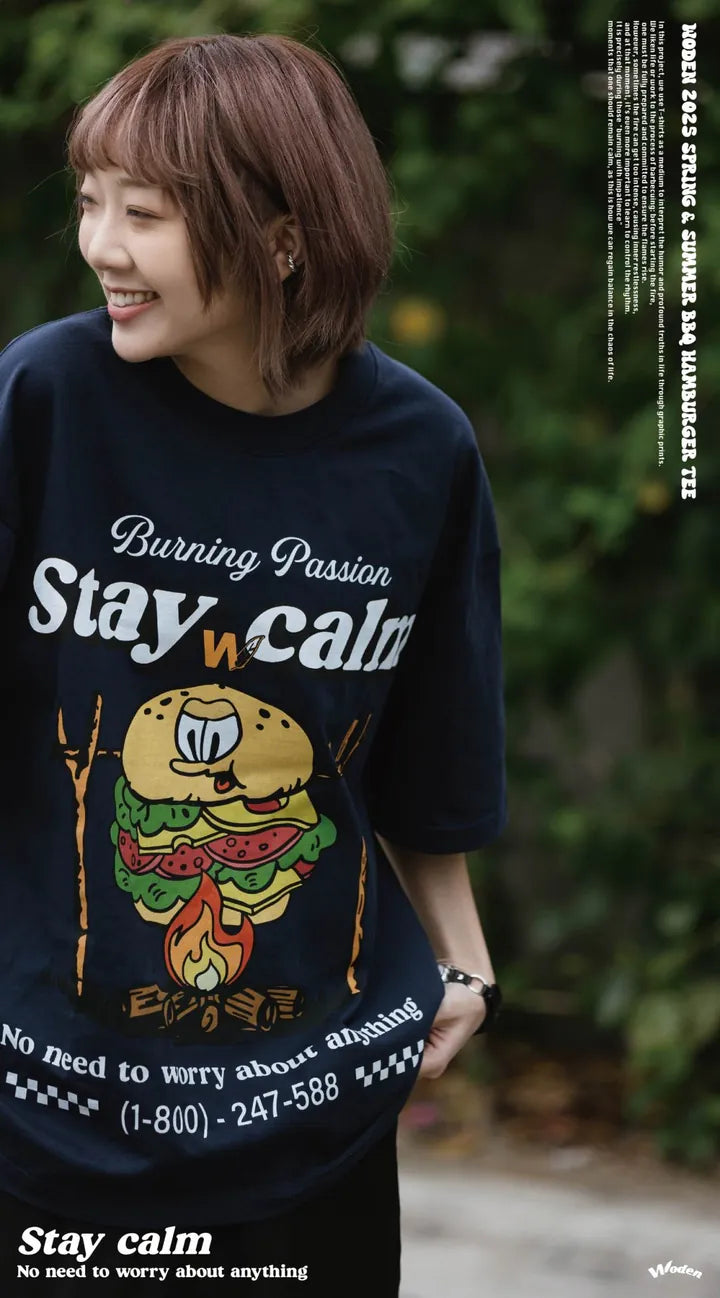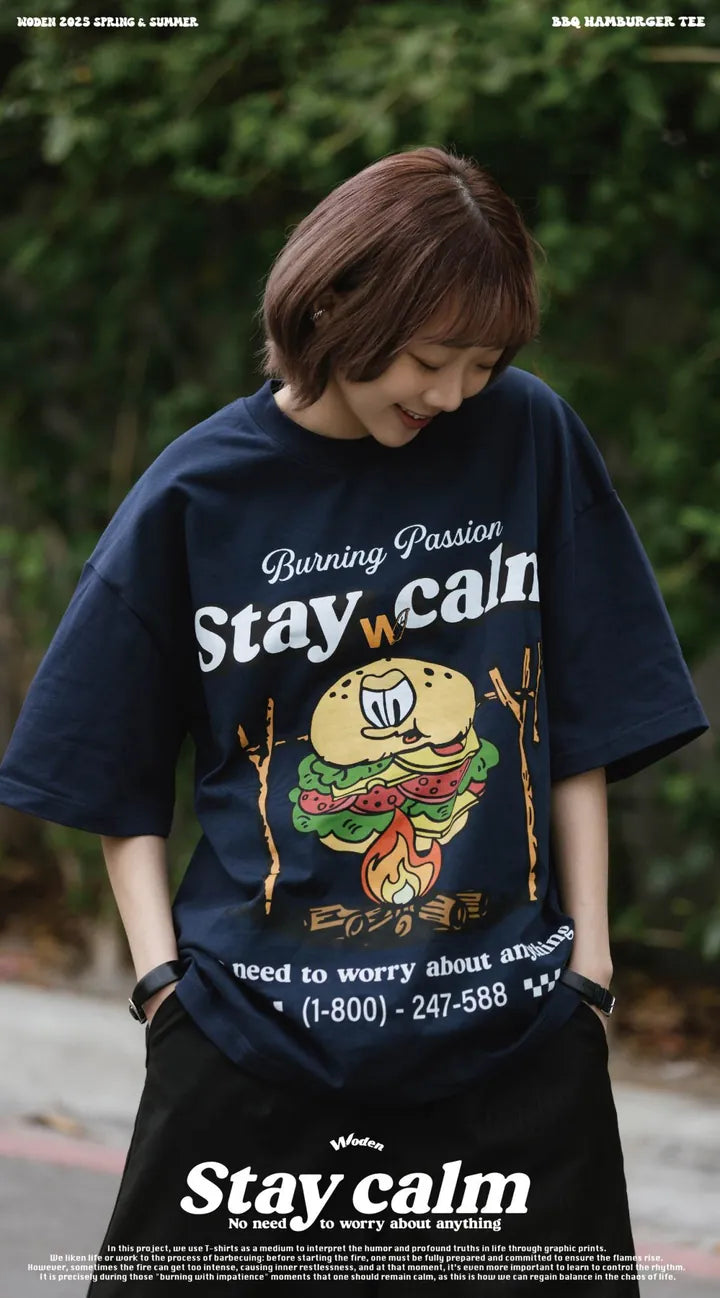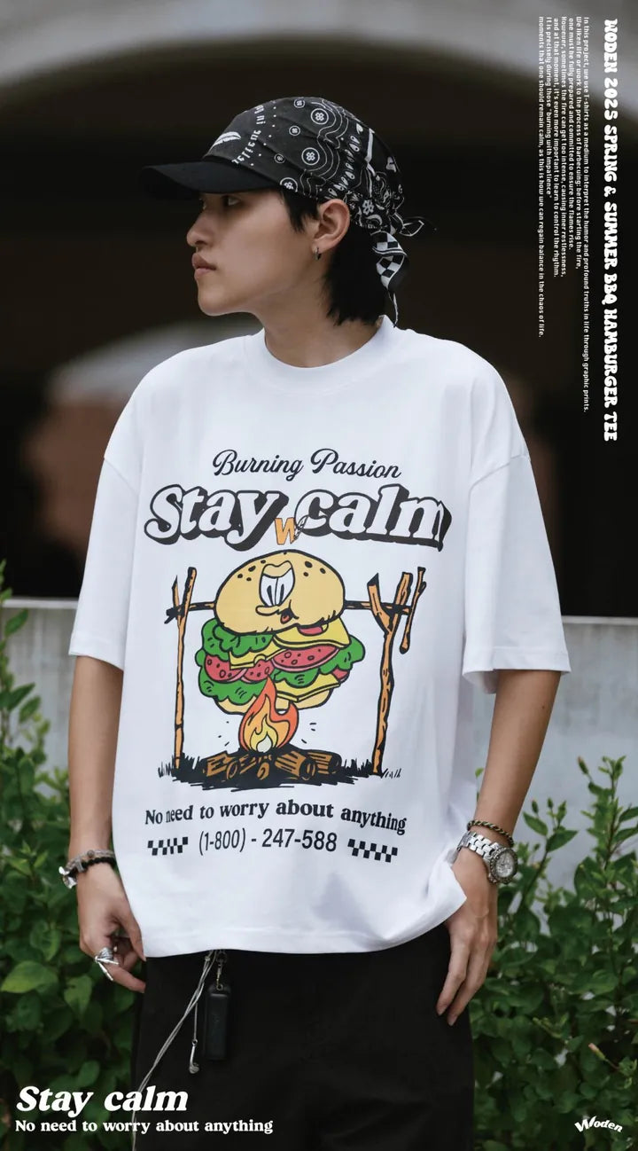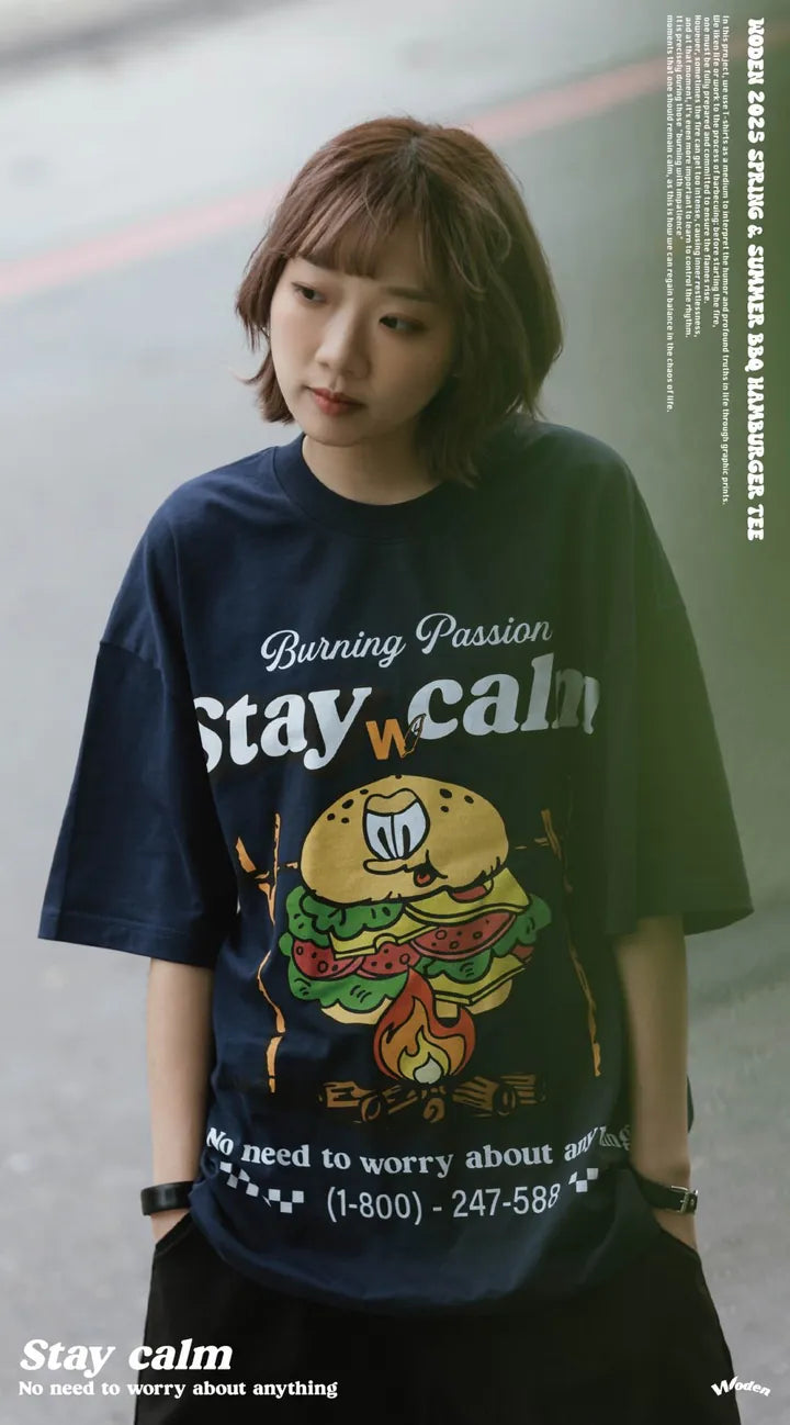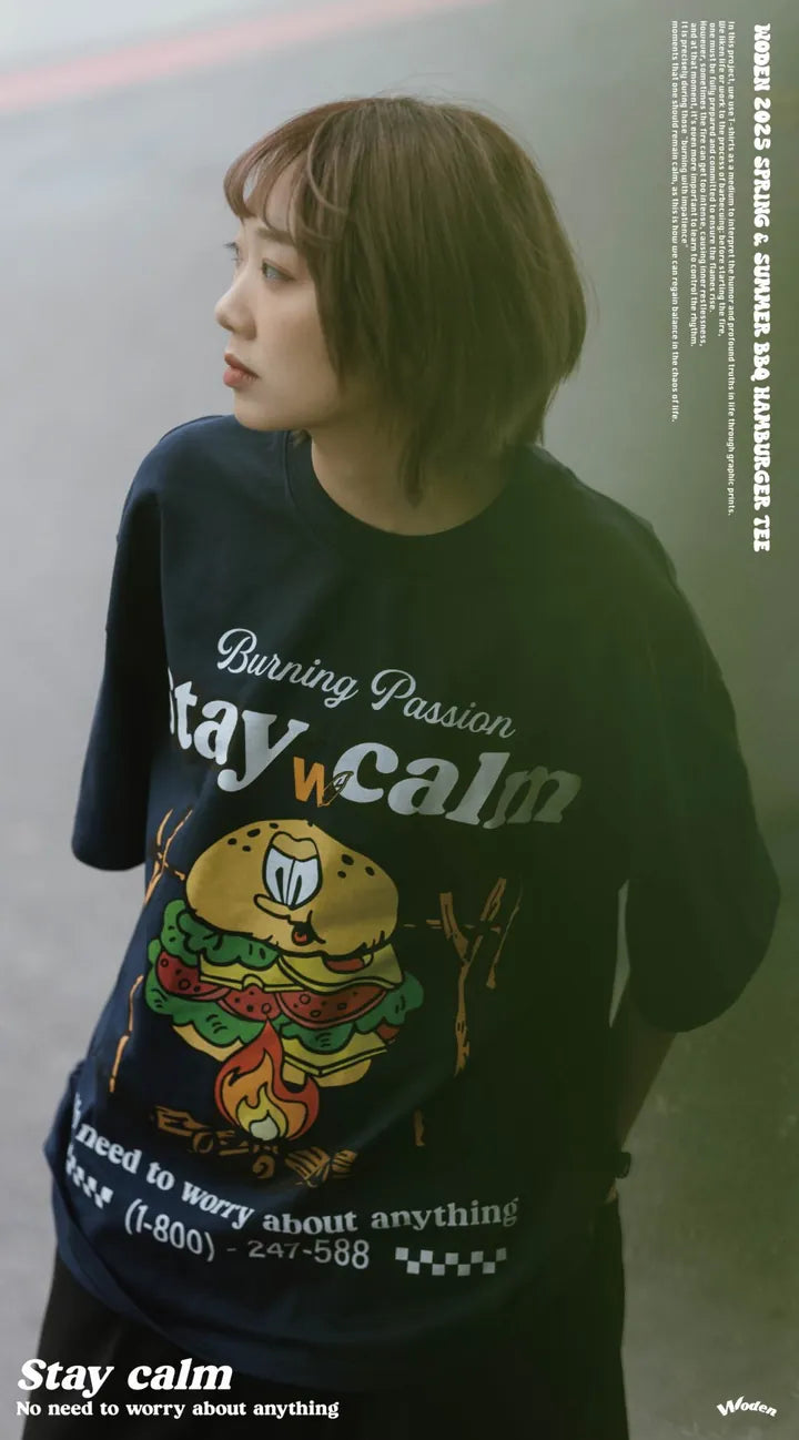 T-shirt正面印花採用美式卡通廣告風格,將正經表情的擬人化漢堡放在焚火上,上方配有「Stay Calm 保持冷靜」和「No need to worry about anything 不用擔心任何事」的字樣,趣味地傳達出『越是焦灼不安,越要冷靜應對的生活態度』。
