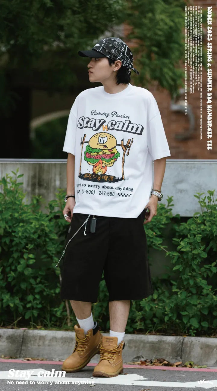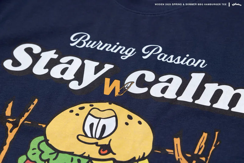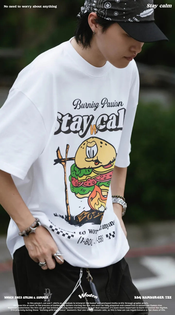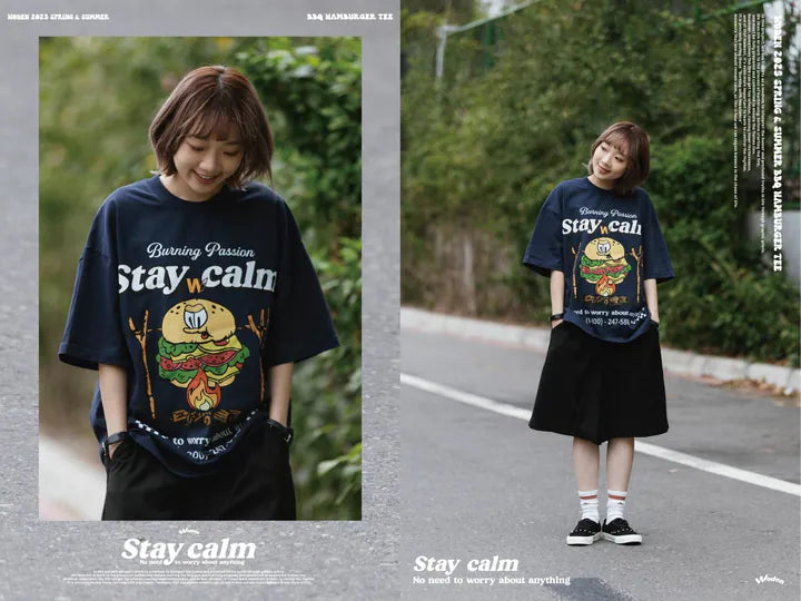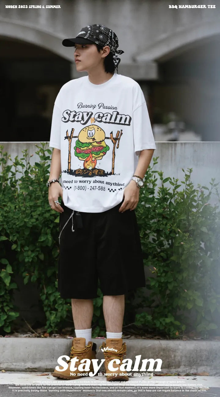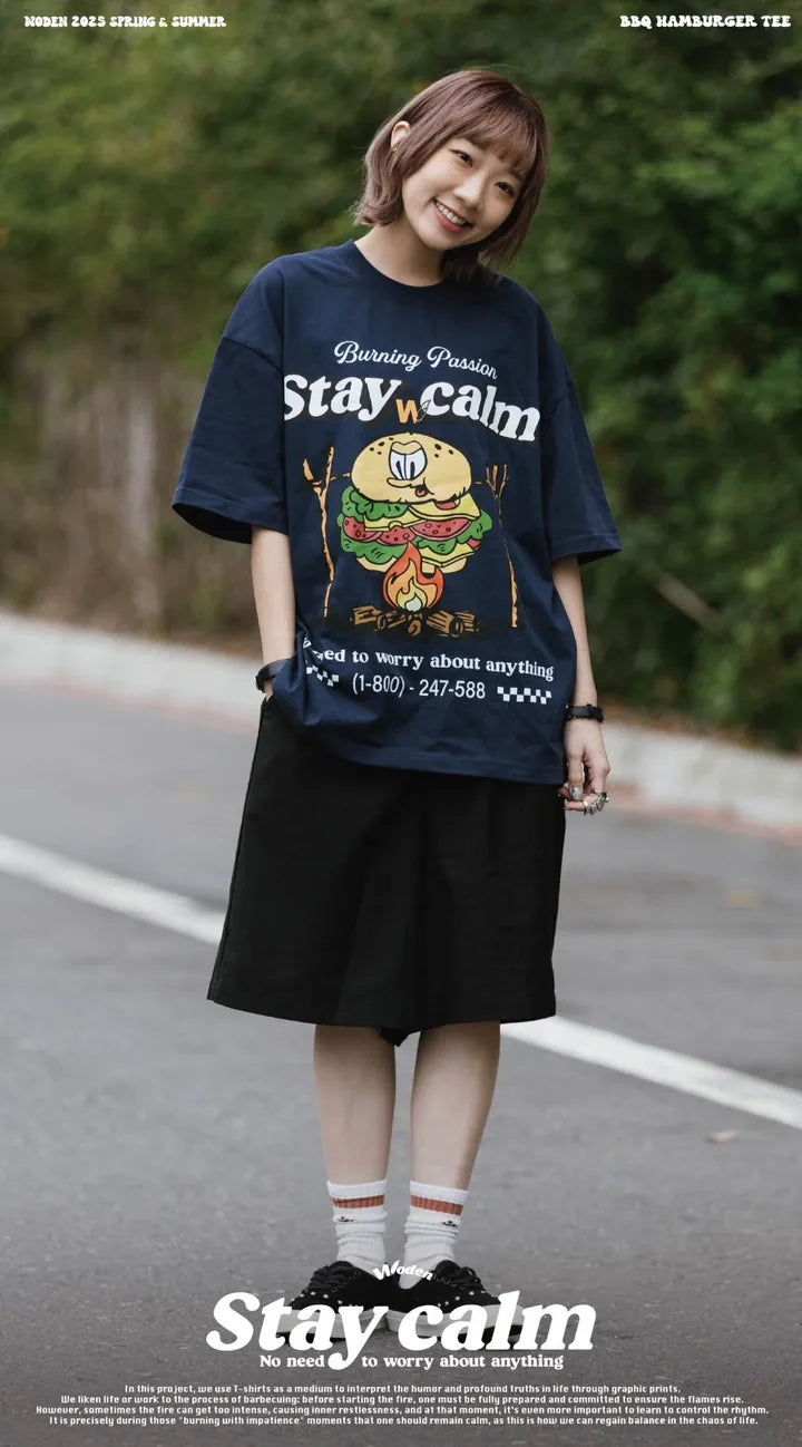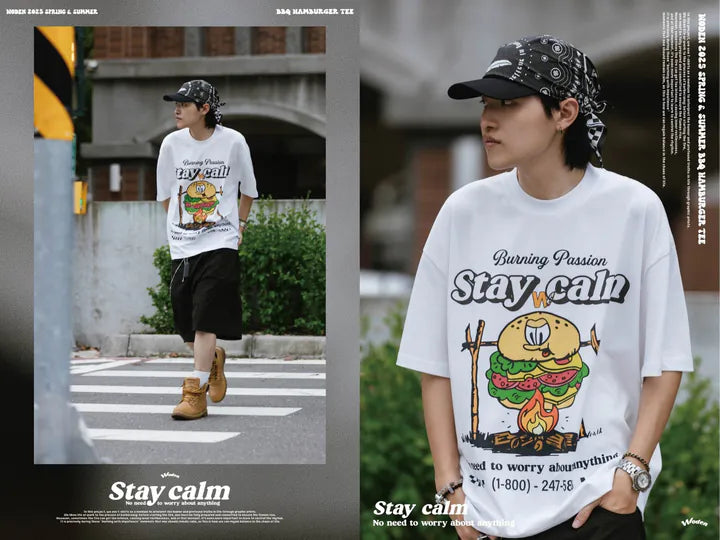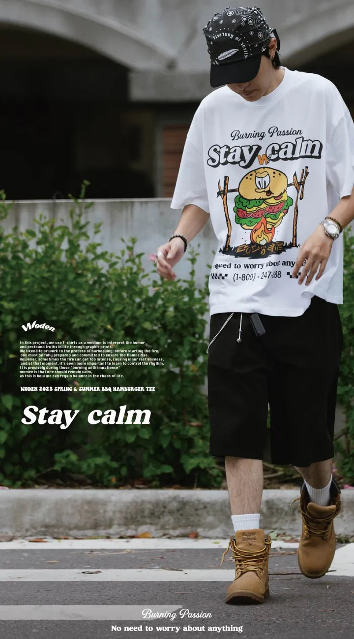 T-shirt正面印花採用美式卡通廣告風格,將正經表情的擬人化漢堡放在焚火上,上方配有「Stay Calm 保持冷靜」和「No need to worry about anything 不用擔心任何事」的字樣,趣味地傳達出『越是焦灼不安,越要冷靜應對的生活態度』。