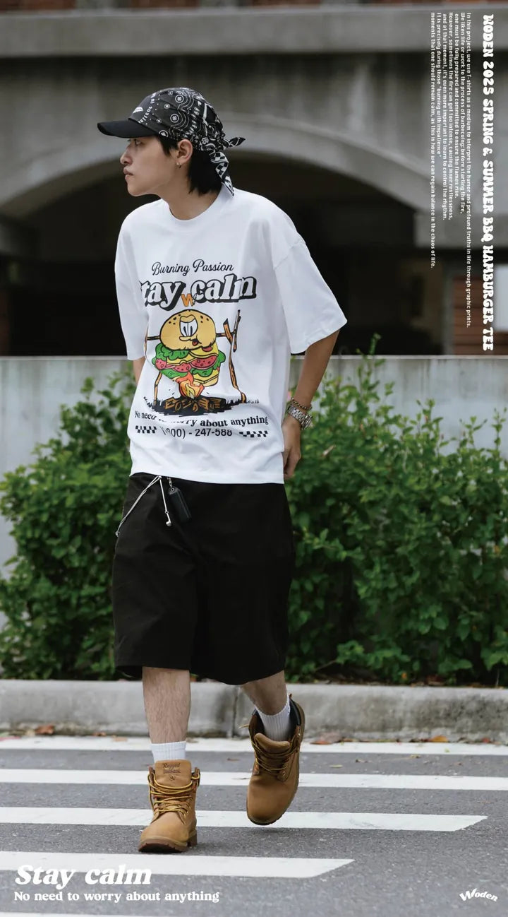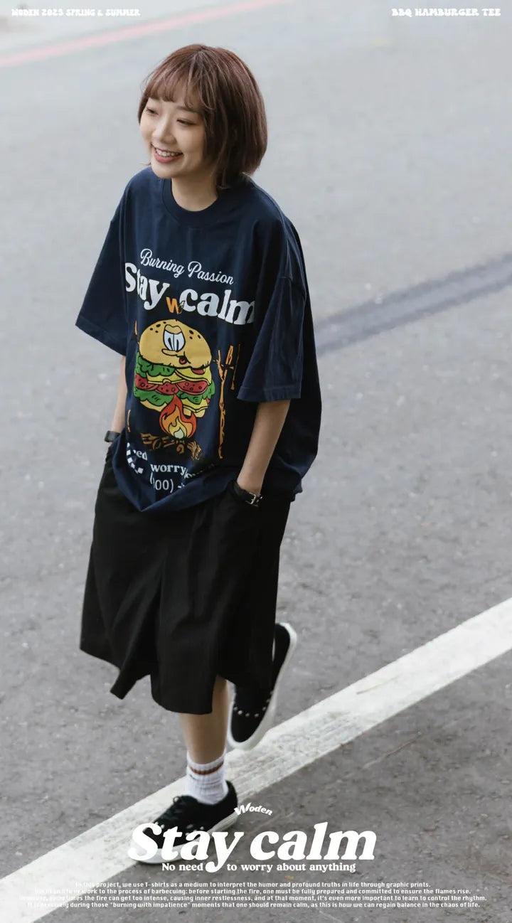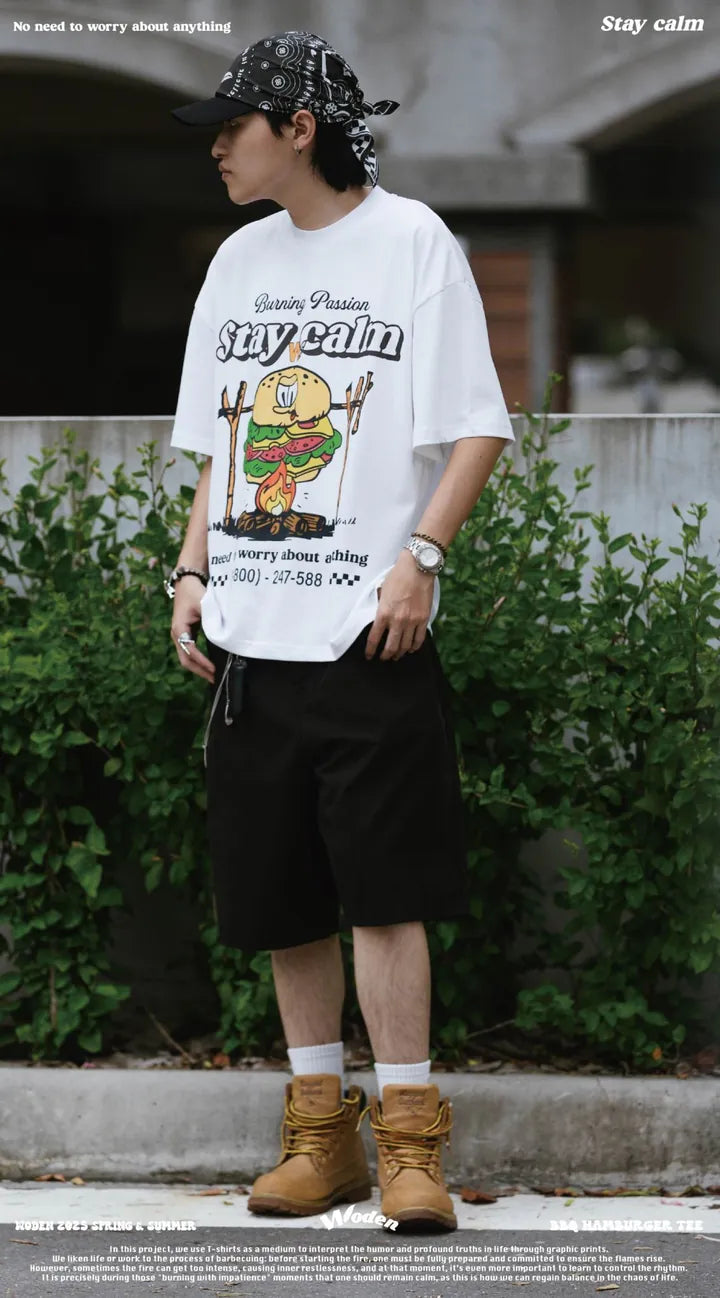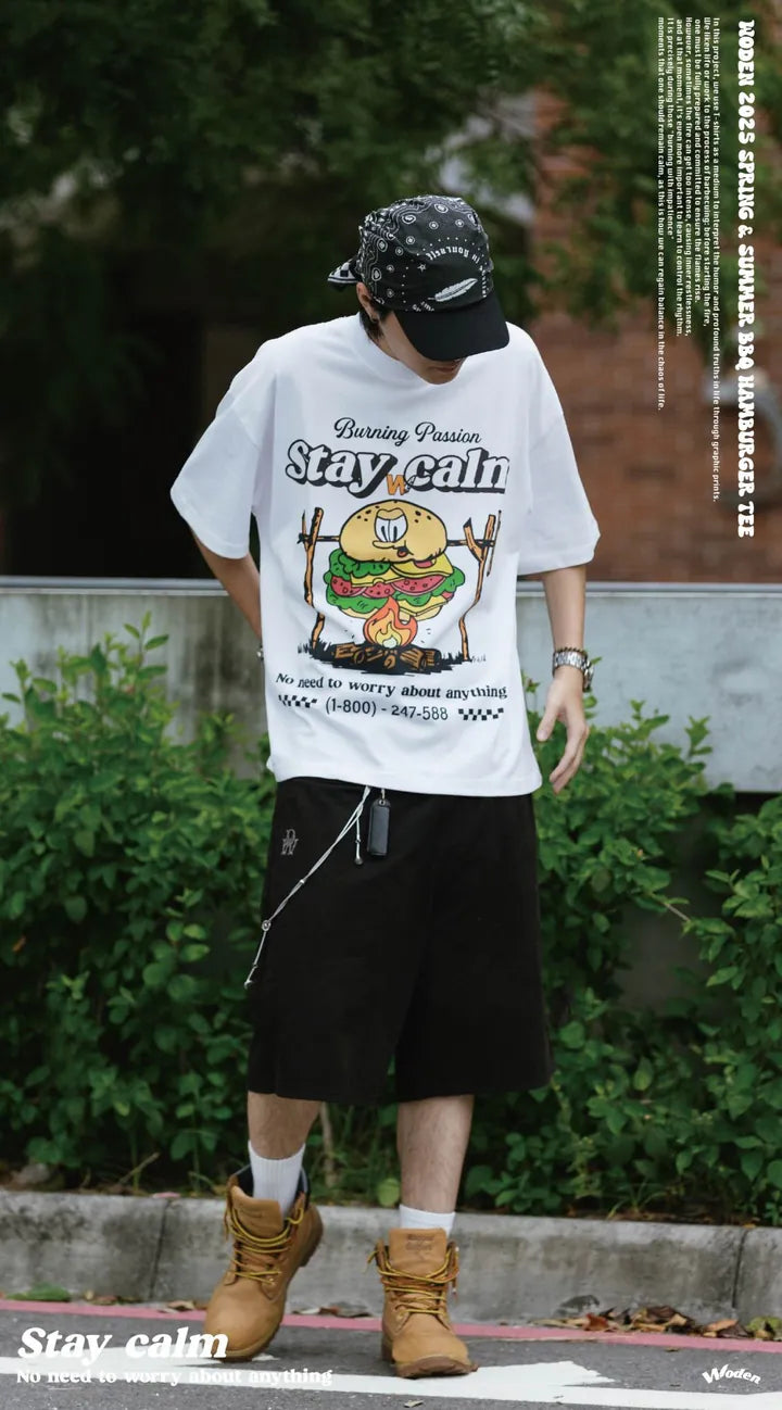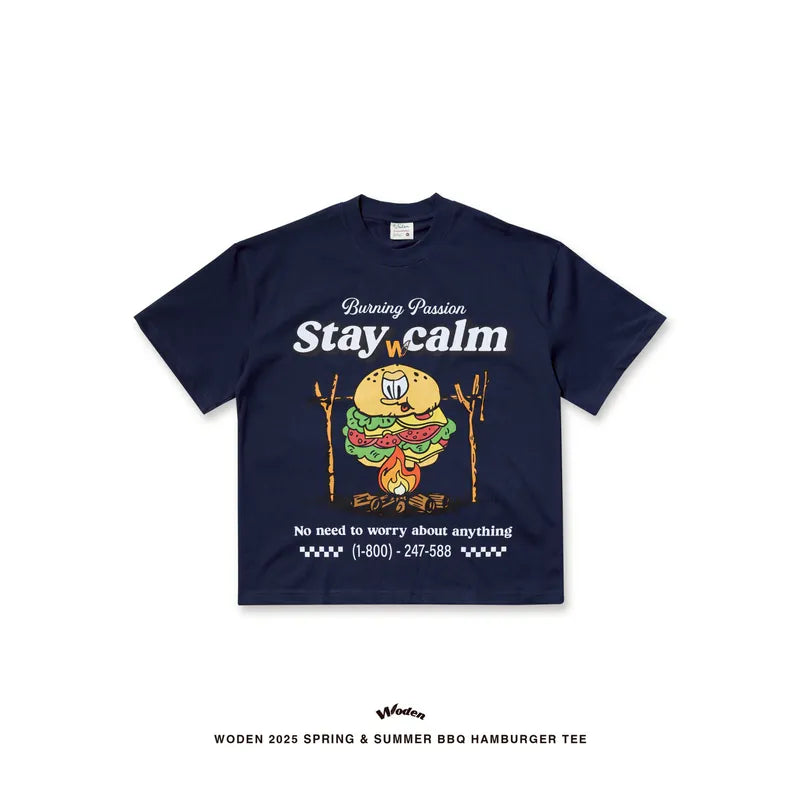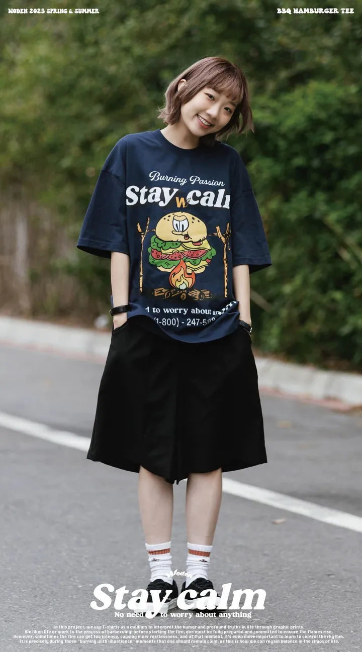 T-shirt正面印花採用美式卡通廣告風格,將正經表情的擬人化漢堡放在焚火上,上方配有「Stay Calm 保持冷靜」和「No need to worry about anything 不用擔心任何事」的字樣,趣味地傳達出『越是焦灼不安,越要冷靜應對的生活態度』。