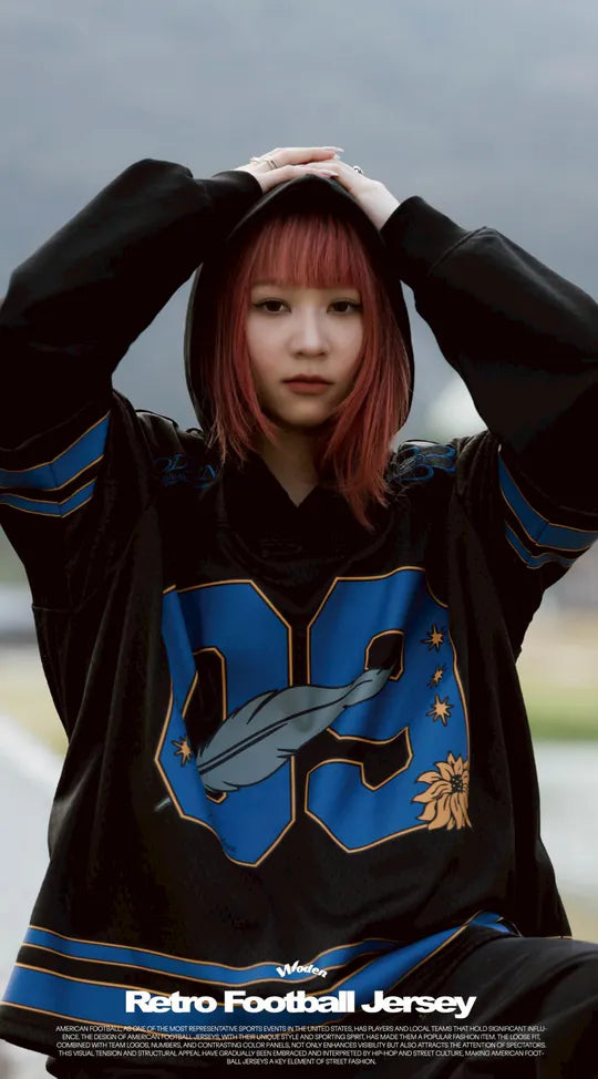 成為深受歡迎的穿搭單品。寬鬆的版型設計,搭配隊徽、號碼與撞色拼接,不僅提升辨識度,更能吸引觀眾目光;這樣的視覺張力與結構感,也逐漸被嘻哈與街頭文化所接納與演繹,讓美式足球衣成為街頭時尚的代表元素之一。