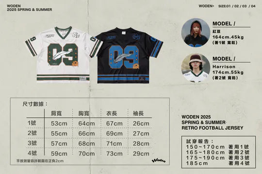 本次WODEN Football Jersey 採用寬短版型,保留美式足球衣的輪廓特色,同時在穿著上更加俐落有型。