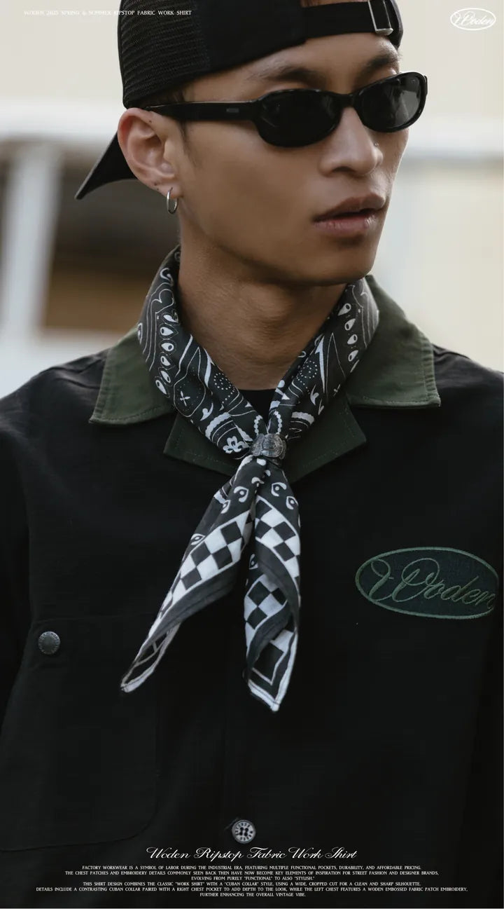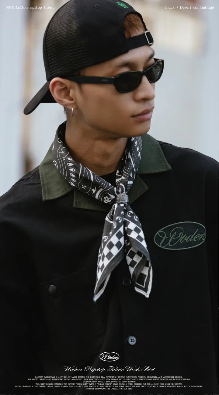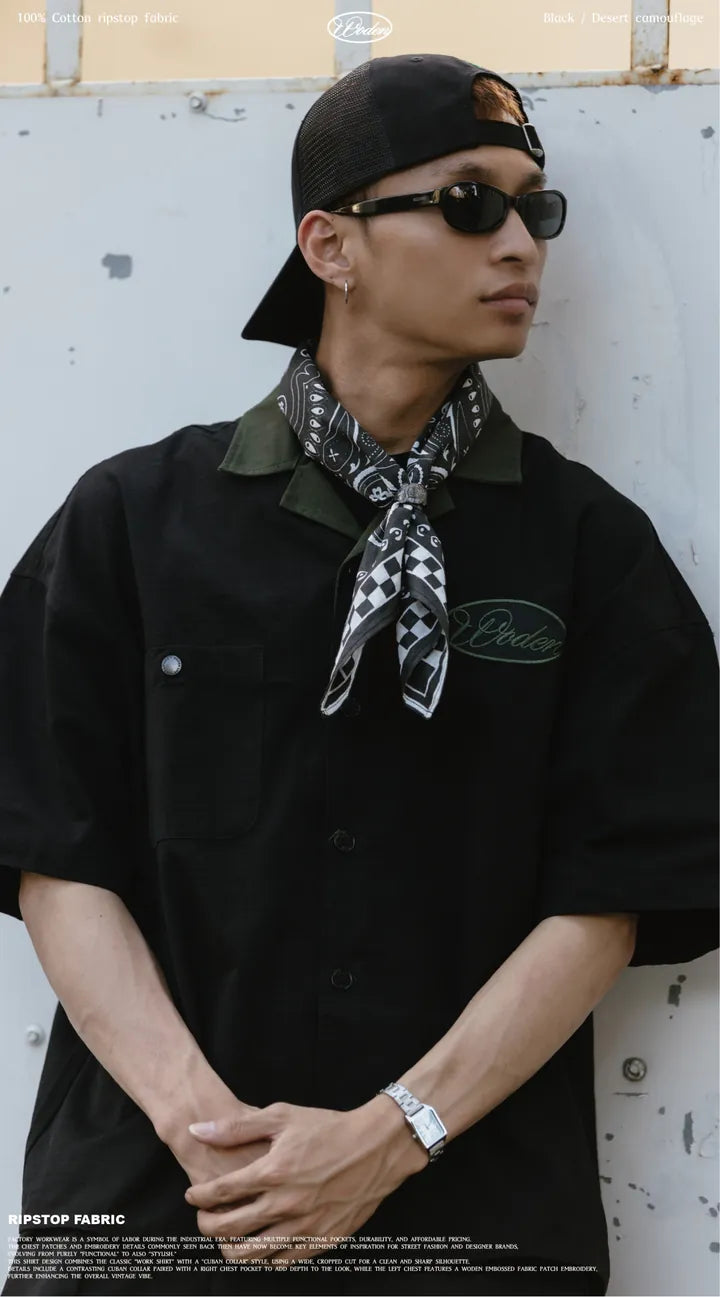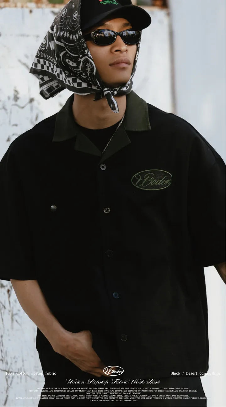 本次襯衫設計將經典『工作襯衫』與『古巴襯』融合,採用寬短版型剪裁,輪廓俐落有型。細節上以撞色古巴領搭配右胸口袋設計,豐富穿著層次,並於左胸配置WODEN雕花字體布章刺繡,進一步強化整體復古氛圍。