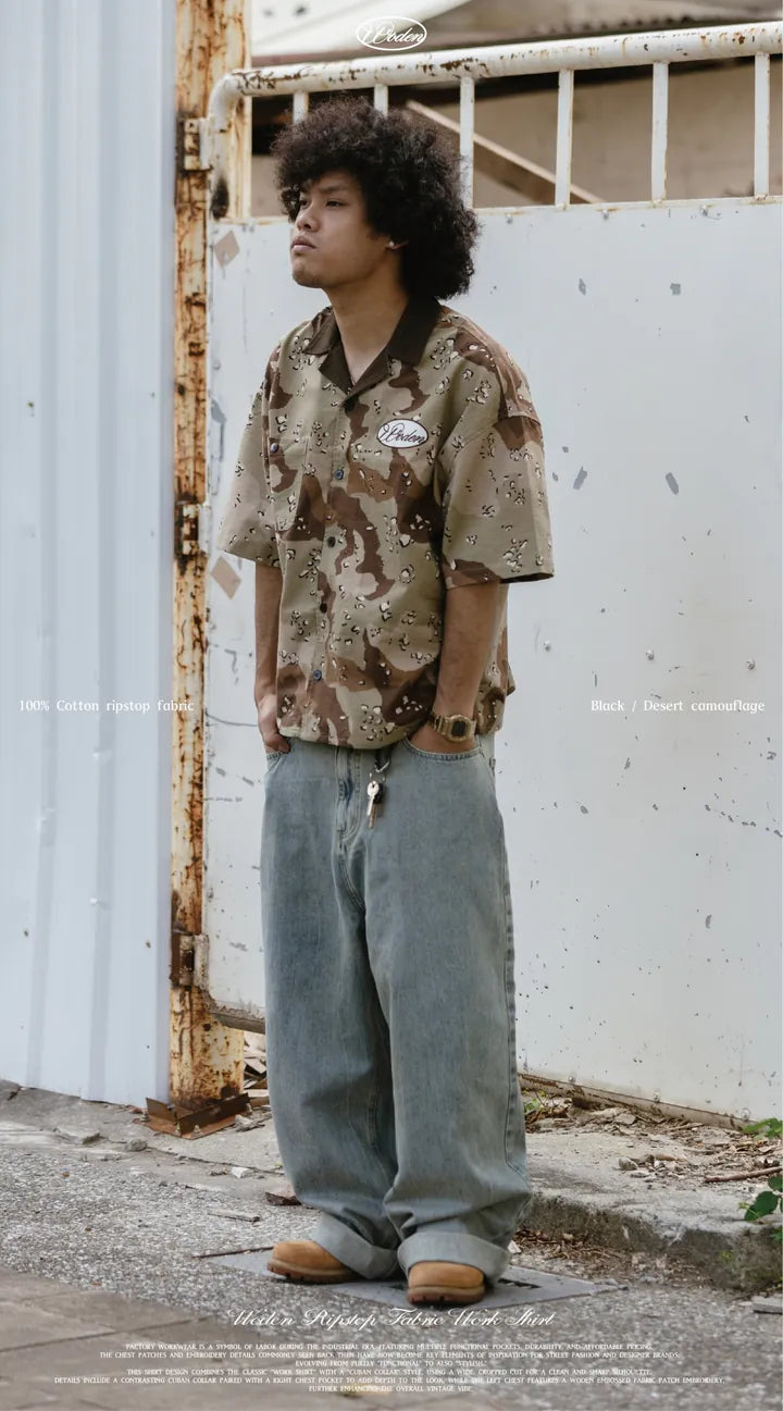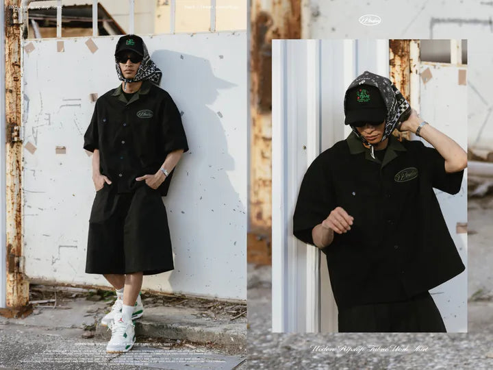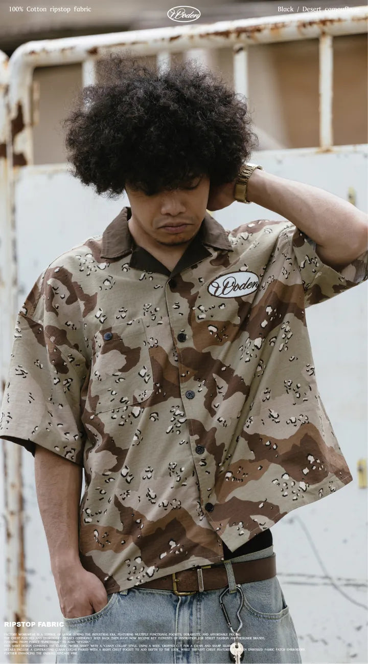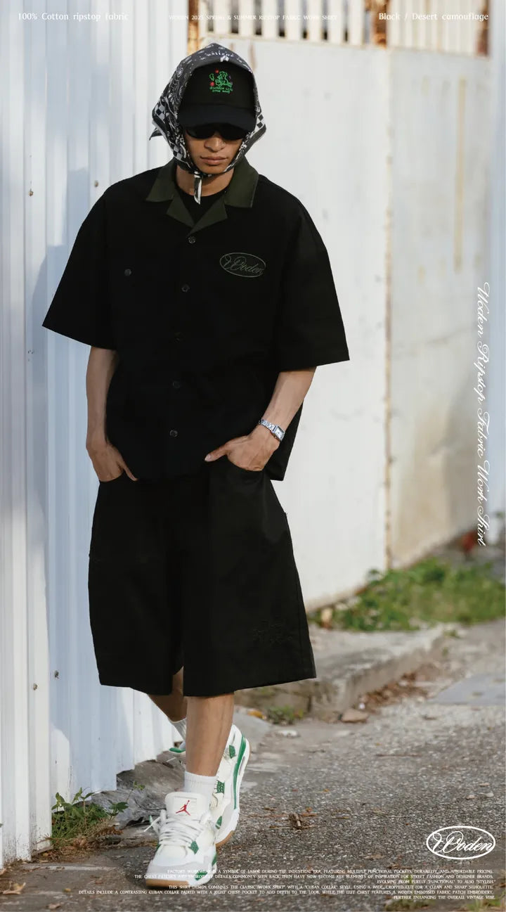本次襯衫設計將經典『工作襯衫』與『古巴襯』融合,採用寬短版型剪裁,輪廓俐落有型。細節上以撞色古巴領搭配右胸口袋設計,豐富穿著層次,並於左胸配置WODEN雕花字體布章刺繡,進一步強化整體復古氛圍。