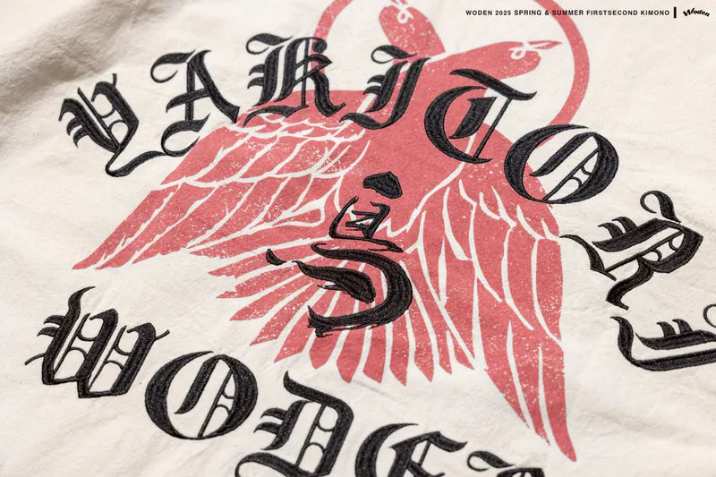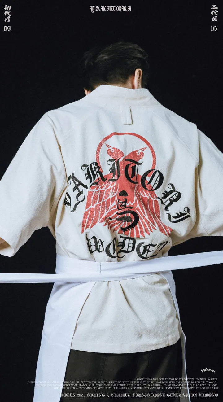 細節上,正面胸口以 初代目 與 二代目 字樣刺繡點綴,袖口則加入 09 與 16 年份符號,呼應兩個世代的承接。背面則以「雙頭鳥」破壞印花為主體,疊加 Yakitori、鳥、WODEN 草體刺繡,多重工藝交織出更豐富的層次感。