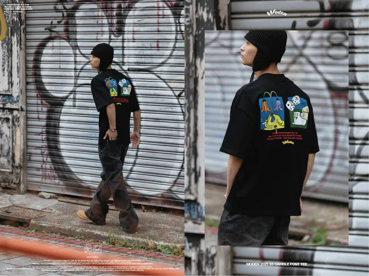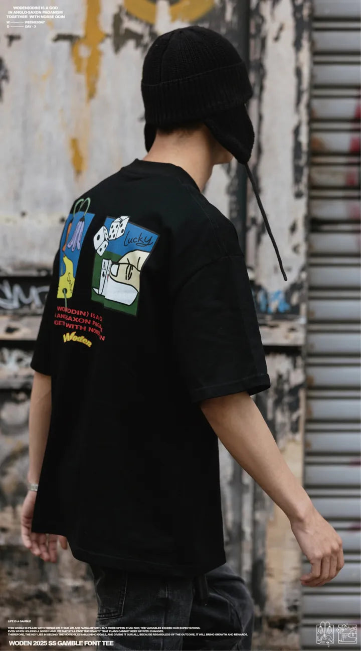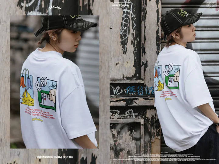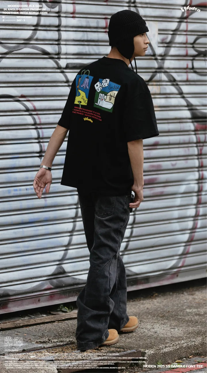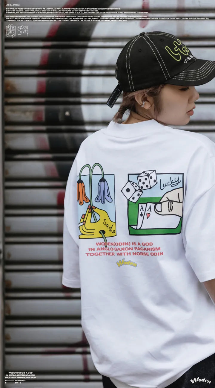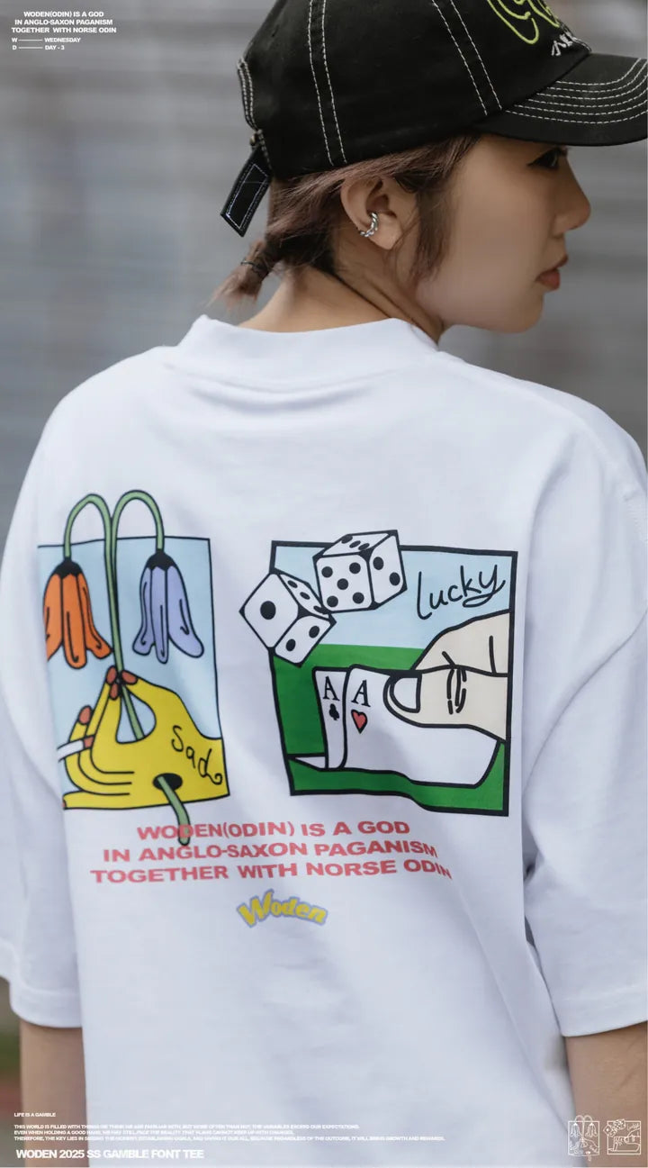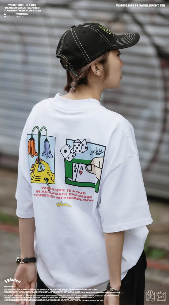 這次,我們透過 T-shirt 來詮釋這個概念。圖像設計上,以鮮豔色彩呈現,希望傳遞對未知未來的樂觀與美好。正面右胸口搭配文字排版,左下擺點綴彩虹織標,增添層次與細節。背面則結合插畫,描繪「賭輸的悲傷」與「賭贏的幸運」,形成強烈對比,進一步傳達 人生如賭局,有起有落,有遺憾也有喜悅 的核心概念。