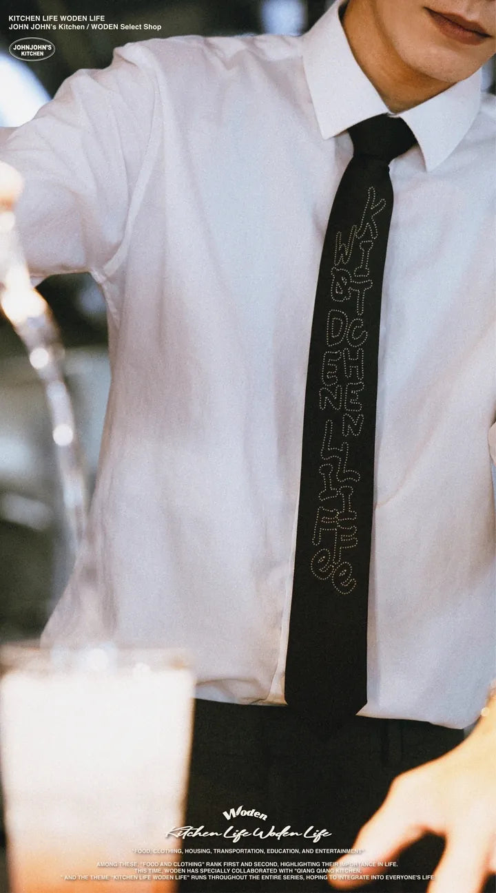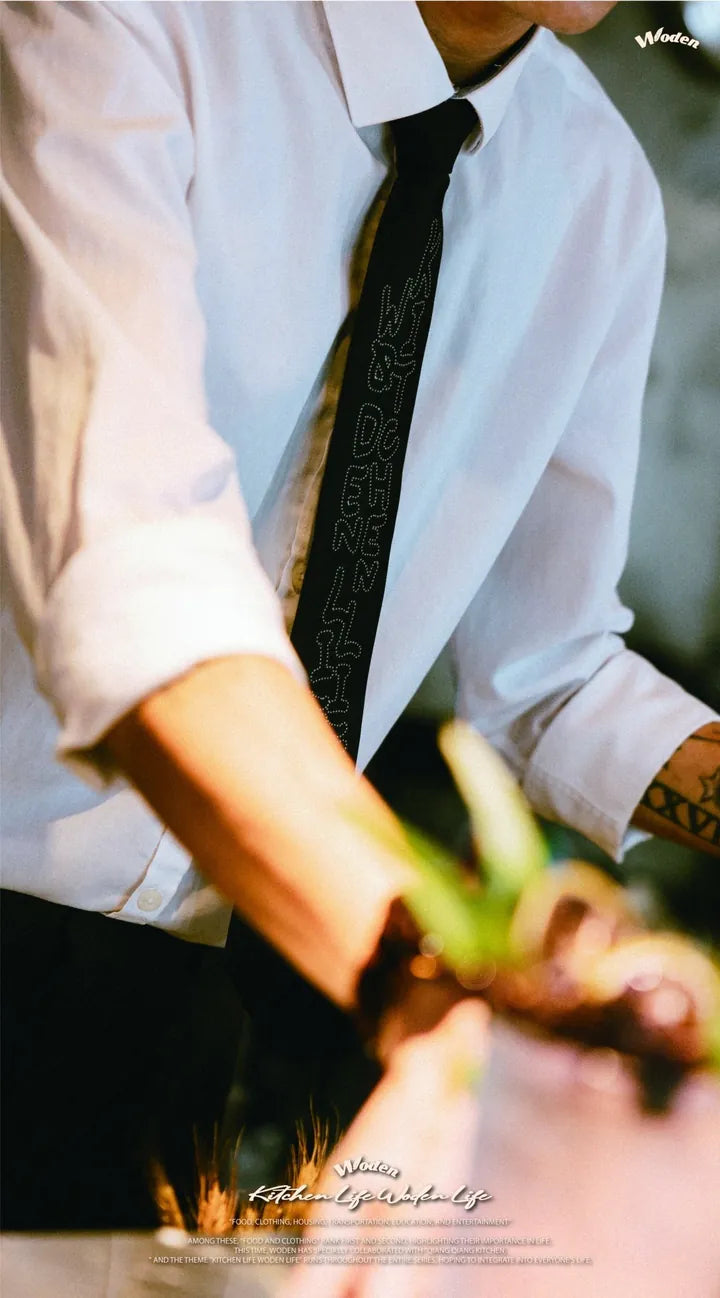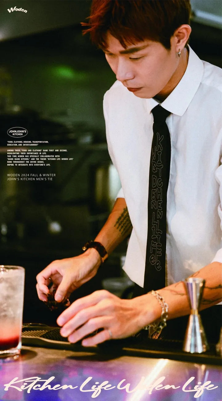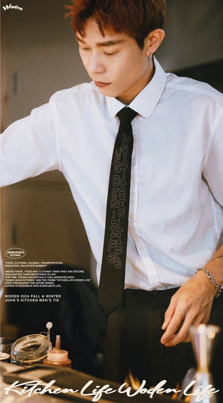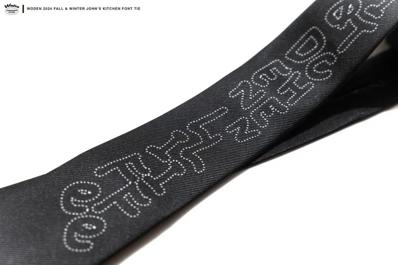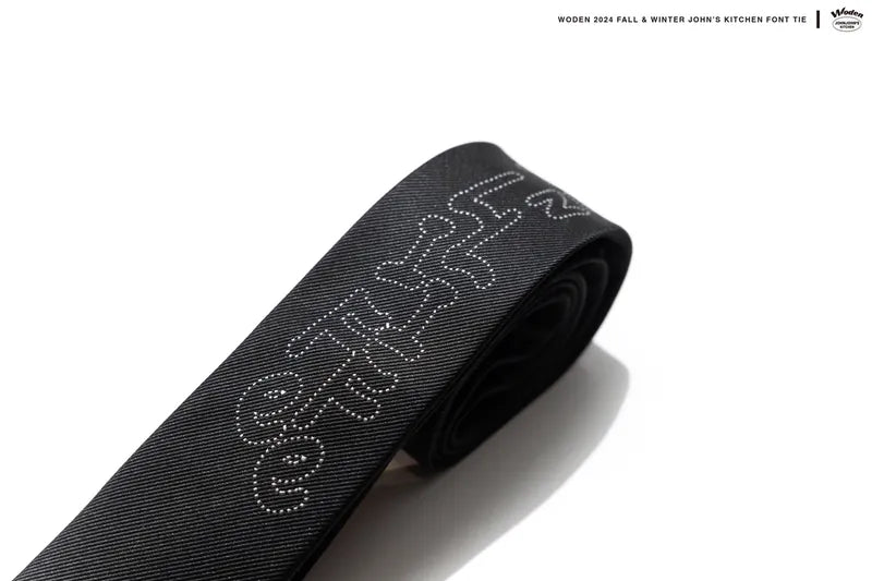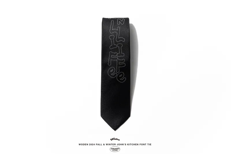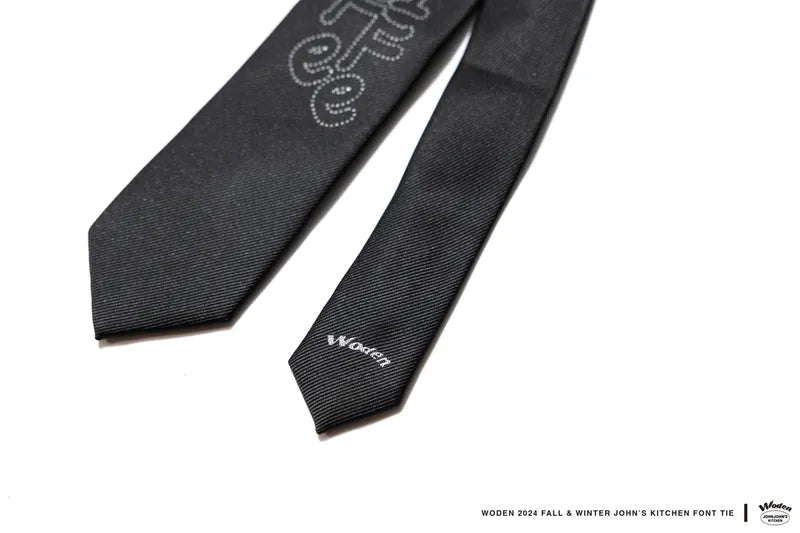 此款領帶以大面積電繡呈現,正面加入本次合作『Kitchen Life WODEN Life』手寫字體,採用精密電繡呈現,黑色底與灰色電繡相互融合不突兀,無論日常穿搭或是搭配西裝穿著都適合。